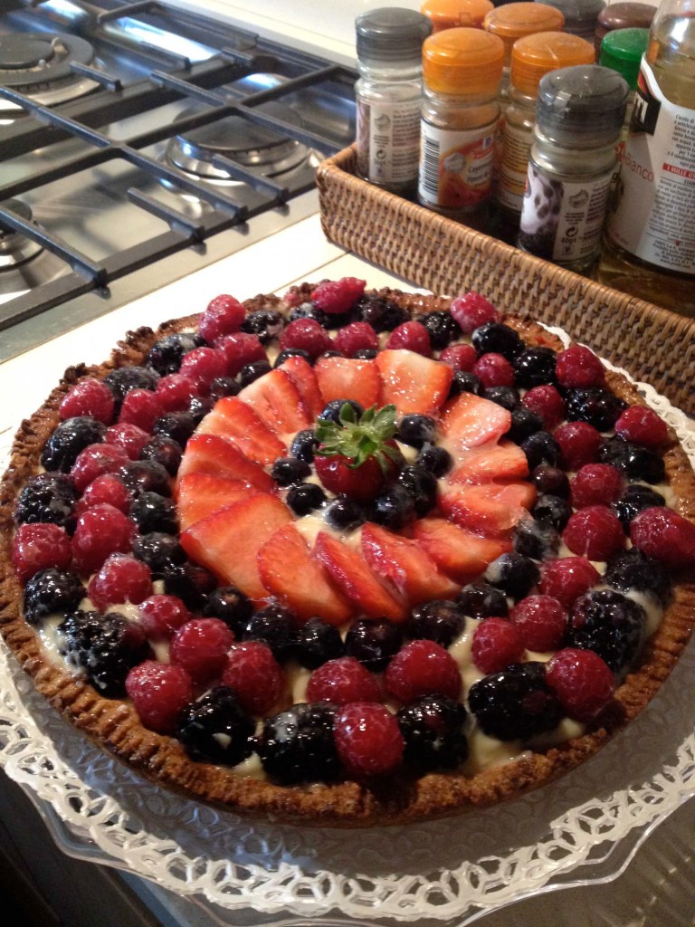 Ora posso stendere la pasta frolla con il mattarello. Per facilitare la cosa e soprattutto trasferirla più facilmente nella teglia la stendo su carta forno e sopra metto un altro foglio di carta forno, così non ho bisogno di aggiungere farina e il matterello scorrerà meglio. Adagiata così sulla teglia, definisco i bordi e con una forchetta bucherello il fondo per evitare che si gonfi.Copro con altra carta forno e metto dei pesi (o le sferette d’acciaio che si trovano in commercio o dei semplici fagioli secchi). Dopo circa venti minuti in forno ventilato a 180 gradi,deve avere una leggera colorazione tiro fuori e faccio raffreddare.Ora verso la crema, ormai fredda e scateno la mia vena artistica posizionando le fette di frutta. La crostata potrebbe essere pronta così, ma se volete esagerare potete spennellare un po’ di gelatina di frutta,la renderà lucida e più invitante.