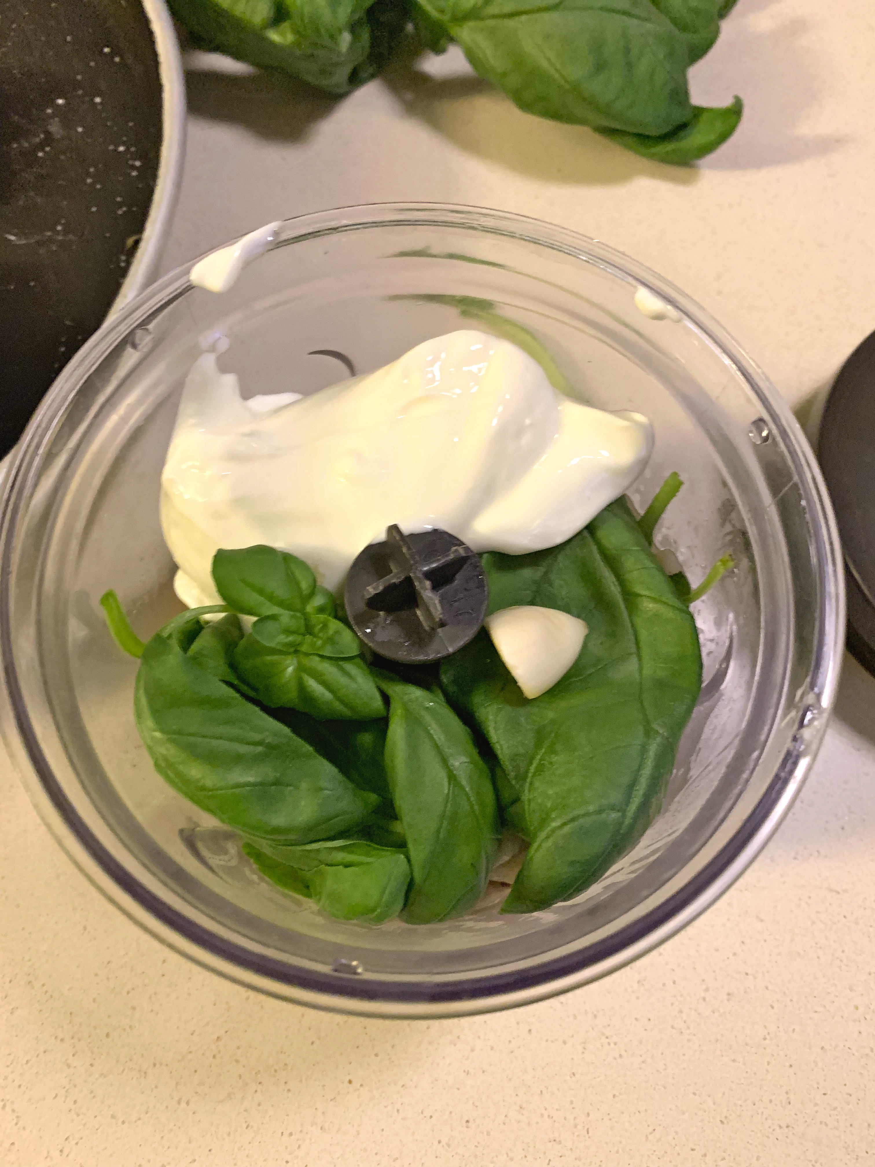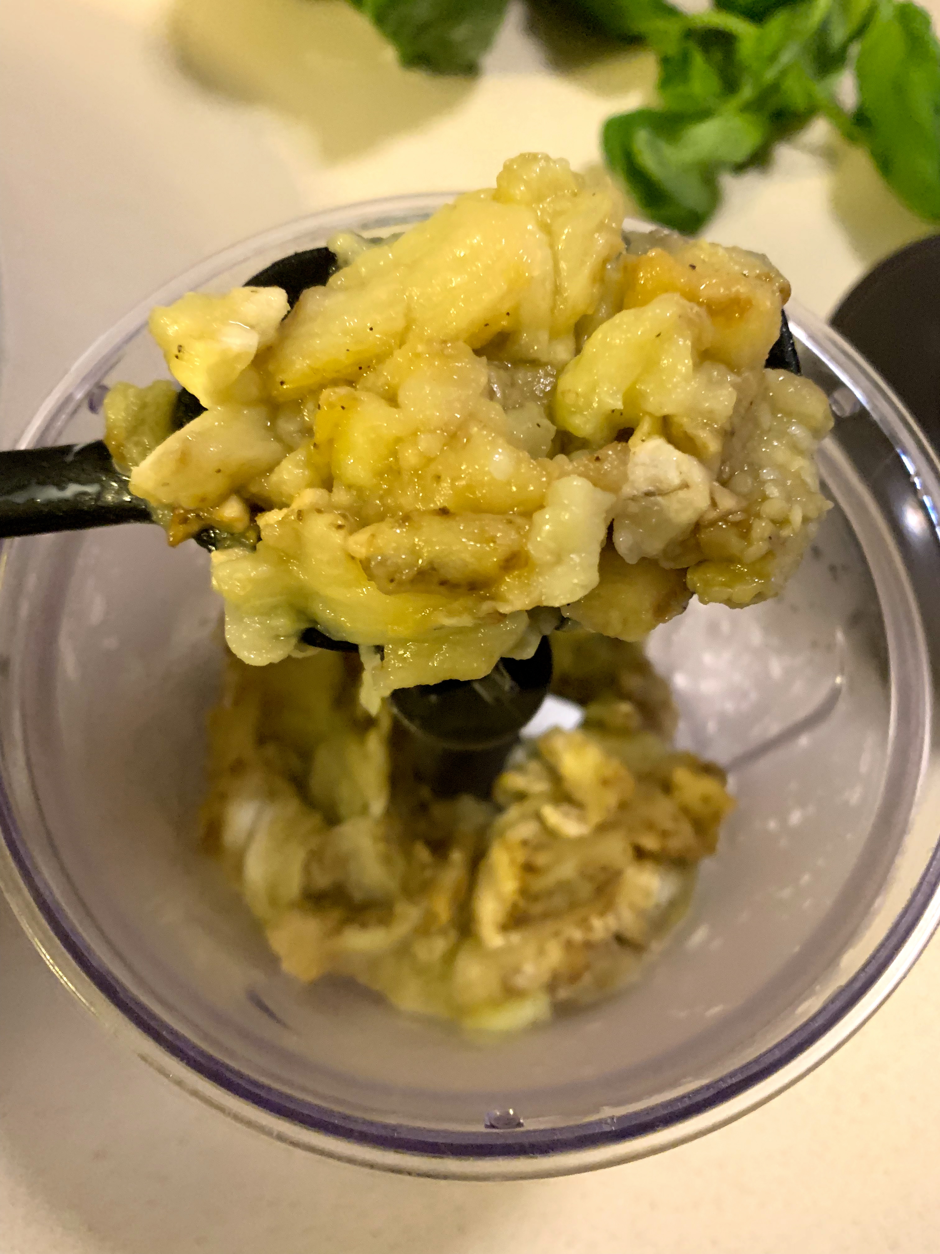 A questo punto ricavate tutta la polpa delle melanzane e mettetela nel bicchiere del mixer. Aggiungete le foglie di basilico, l’aglio, lo yogurt e frullate sino ad ottenere una crema. Ora potete aggiungere il burro, frullate ancora. Fate raffreddare. Il patè è pronto.