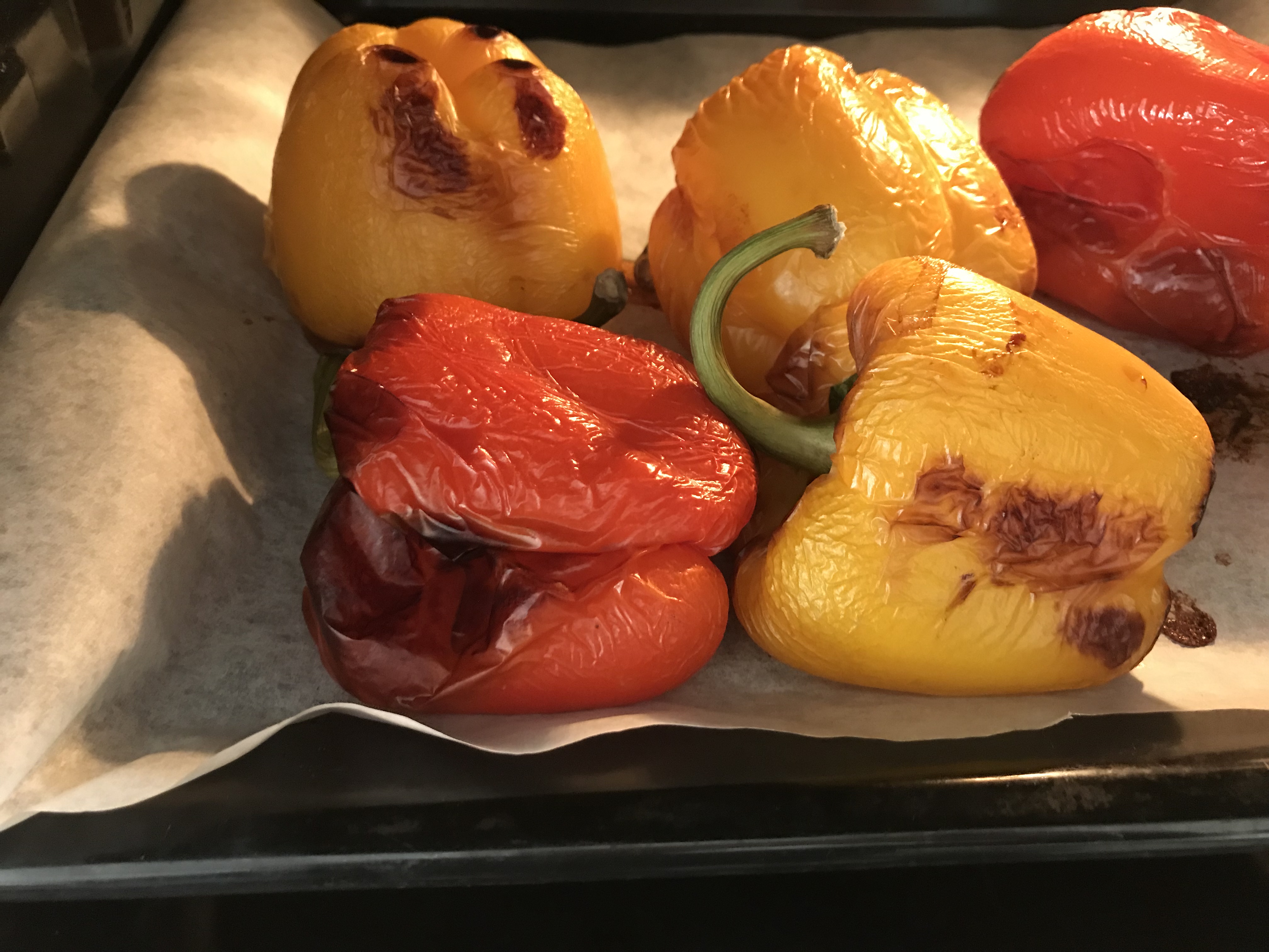 Nella teglia foderata di carta forno disponete i peperoni interi e mettete a 160 gradi. Girateli man mano che cuociono in modo che si colorino in ogni parte. Li ho infornati stamattina prima ancora di uscire con il cagnetto per la sua passeggiata mattutina!