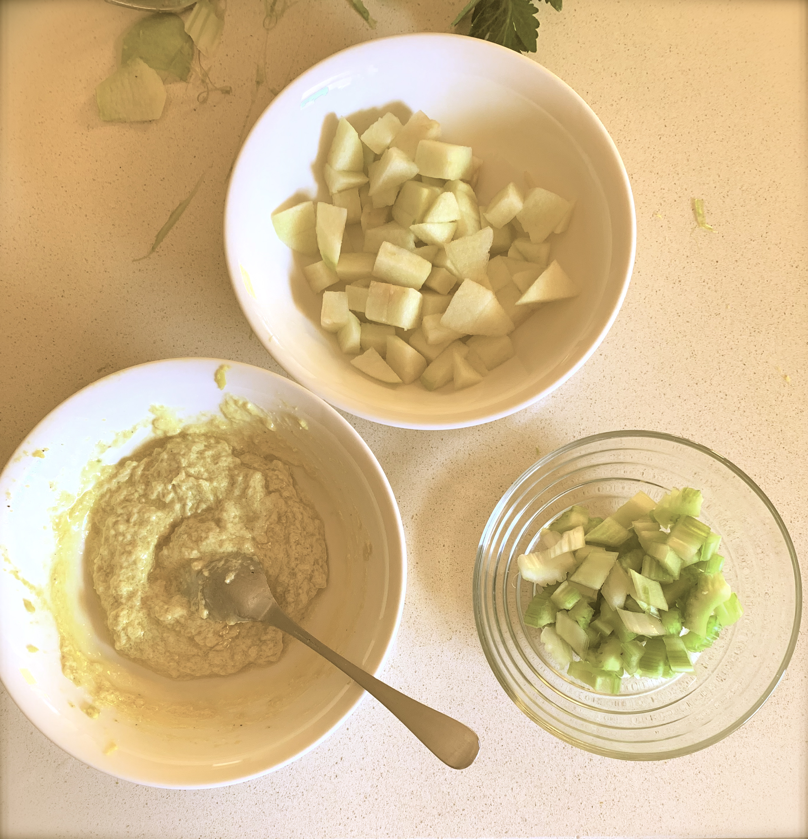 Sbucciate e tagliate a piccoli cubetti le mele e mettetele in una ciotola.. Lavate le costole del sedano e eliminate le parti filamentose. Tagliatele a piccoli pezzi e metteteli da parte. Aprite per lungo l’avocado maturo e ricavate solo la polpa. Tagliatela a pezzetti e mettetela nel bicchiere del mixer, salate e pepate. Aggiungete un cucchiaio di maionese e frullate.