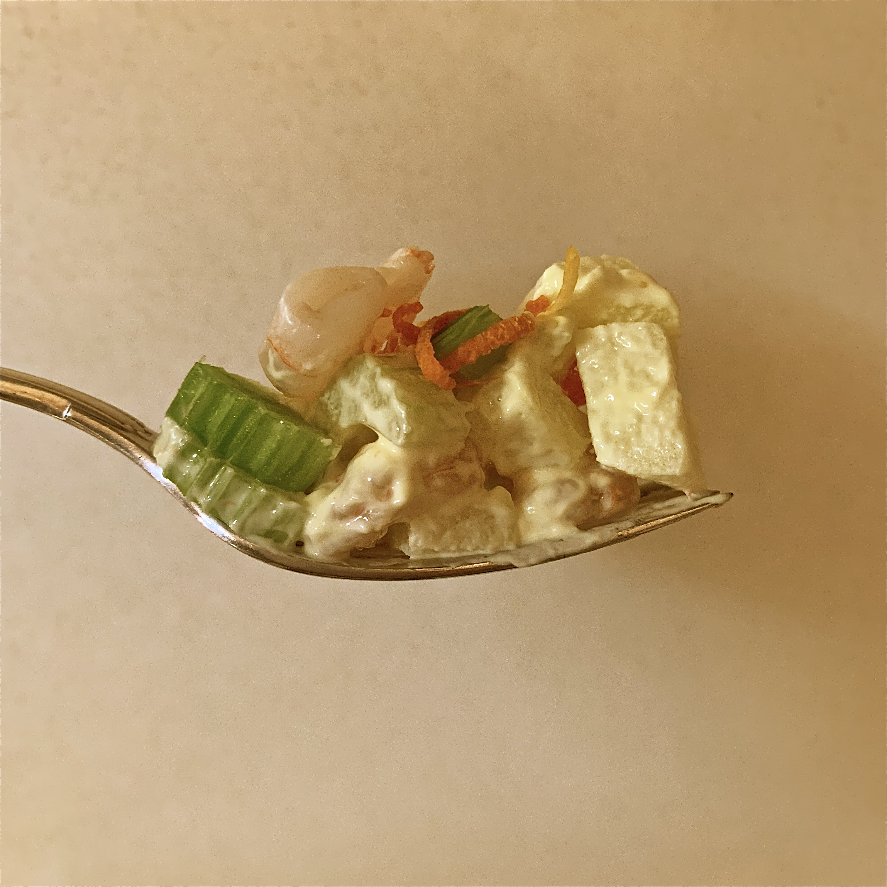 Questo antipasto, o insalata se volete, l’ho assaggiato tanti anni fa a casa di amici. Con qualche variazione è diventata un piatto fresco, sano, goloso e croccante. Lo servo sia in una grande ciotola a tavola o in piccoli bicchierini per un aperitivo in piedi. Gli ingredienti base erano sedano, mele verdi e avocado. Io ho aggiunto gamberetti sgusciati, scorza di limone e di arancia, un cucchiaino di maionese per aiutare la salsa.