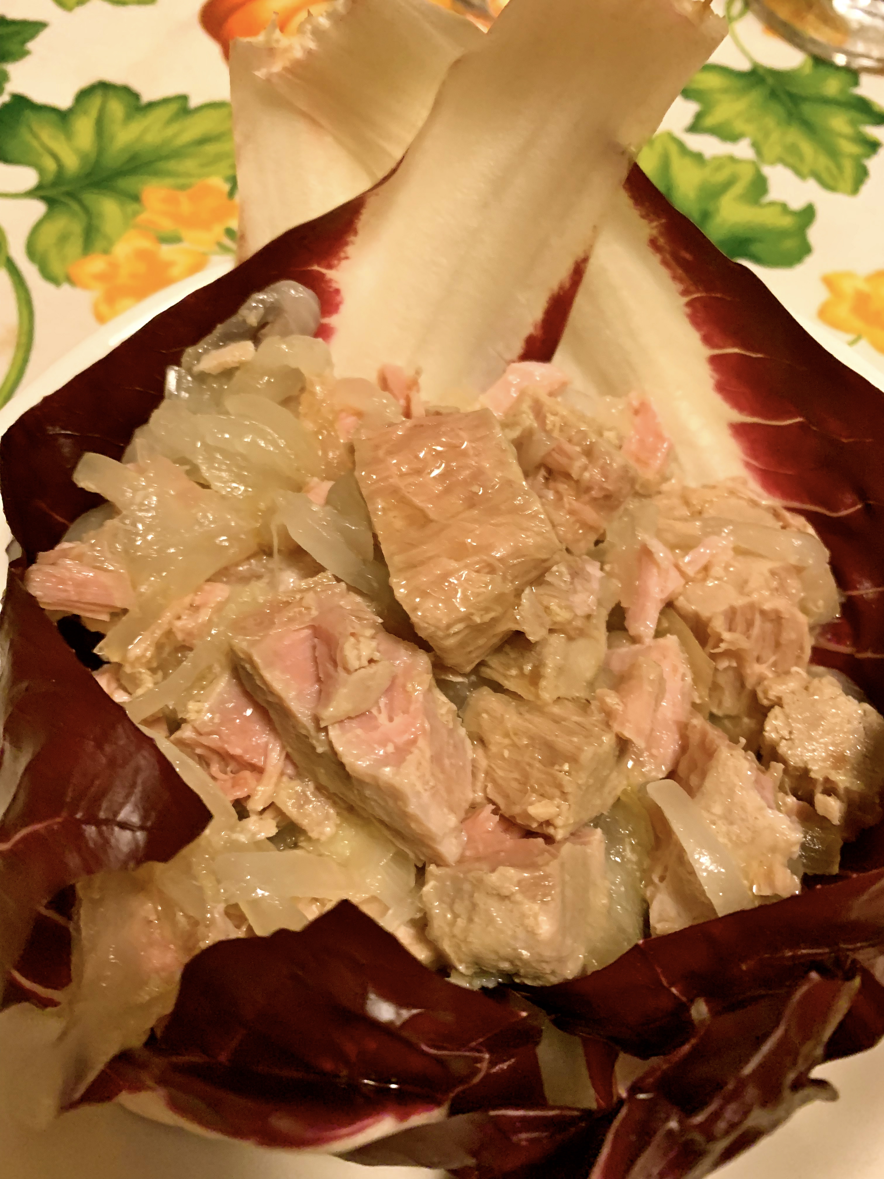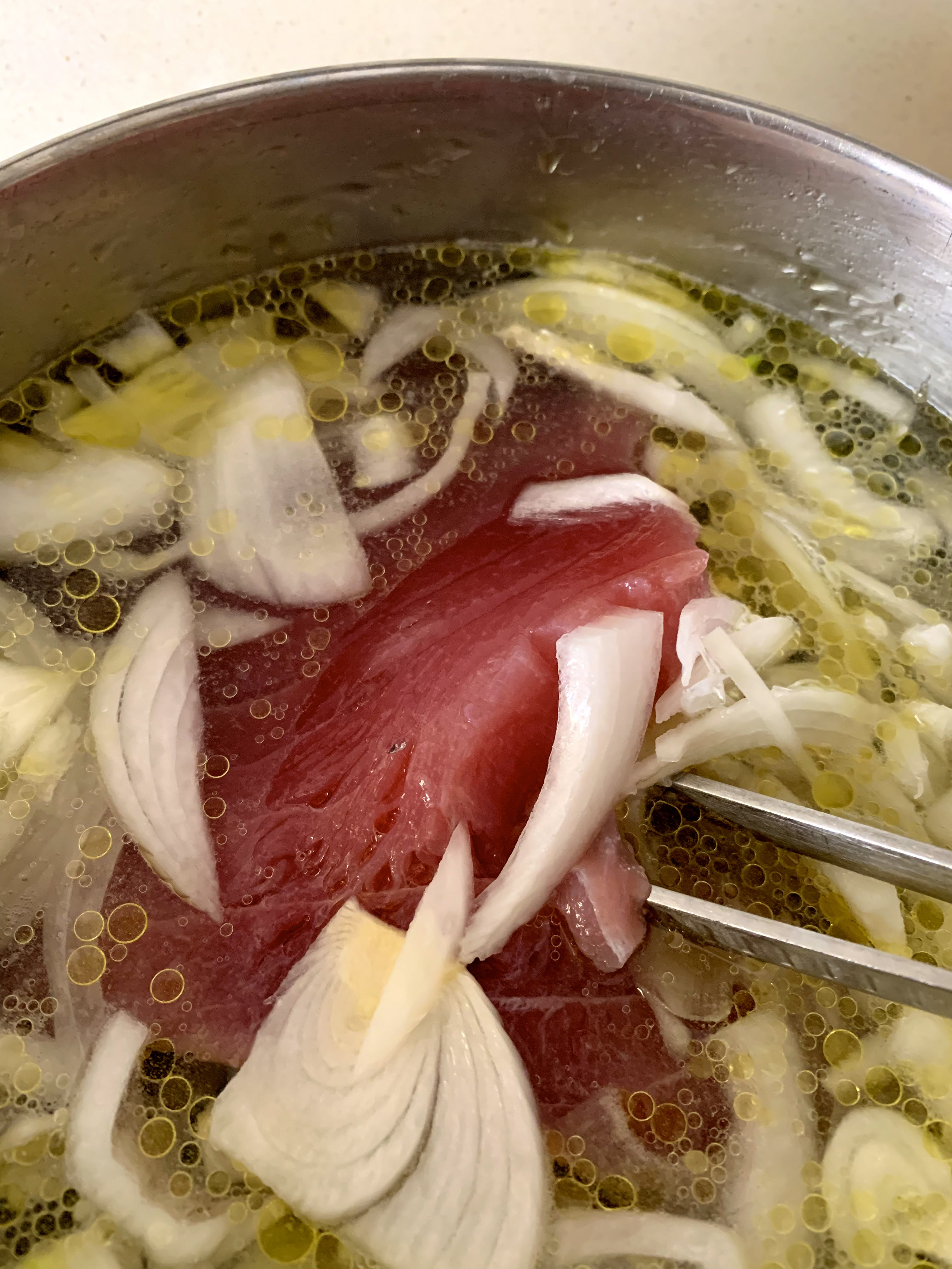 Ho messo la trancia di tonno in pentola e l’ho coperta d’acqua. Ho aggiunto due cucchiai di aceto bianco, due cucchiai di olio extra vergine d’oliva, un pugnetto di sale grosso, mezzo limone spremuto, una grossa cipolla bianca tagliata a fettine medie. Ho fatto bollire per una trentina di minuti, ho scolato il tutto e fatto raffreddare. Ho aggiustato con sale e pepe e aggiunto un poco d’olio e di aceto!! Enjoy……