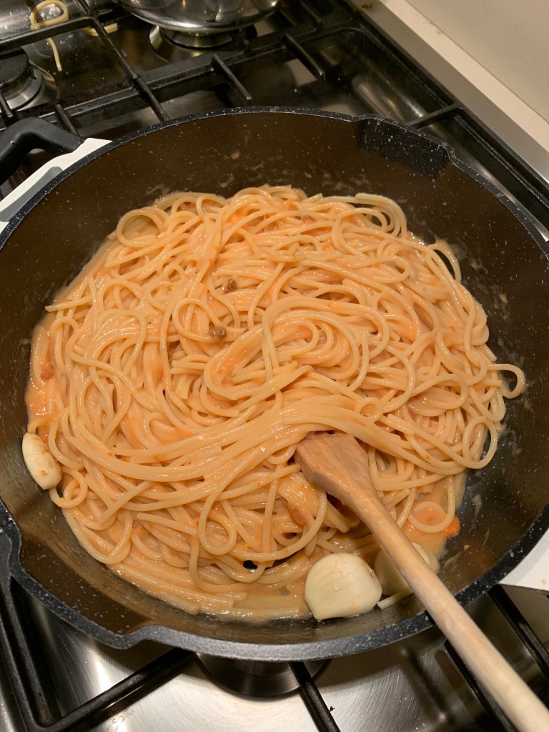 Quando invece è periodo di asparagi li faccio sbollentare una decina di minuti in acqua per togliere un po’ di amaro. Le sommità le faccio saltare in padella con l’aglio intero, in questo caso non occorre il peperoncino. Scolo la pasta grondante, quando ottengo la cremina spengo e condisco con la polpa del riccio.