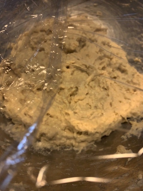 In una grande ciotola versate le due farine ed il sale. Con la mano miscelatele per qualche minuto, unite lo zucchero e miscelate ancora. Prendete una forchetta e versate mescolando l’acqua e il lievito essicato. Se usate quello fresco lo avrete sciolto prima nell’acqua. Mescolate con la forchetta sino ad ottenere una pappetta molliccia e rugosa. Il vostro lavoro per ora è finito. Coprite con la pellicola e lasciatelo dentro la credenza almeno 12/14 ore. Dovrà più che raddoppiare e riempirsi di enormi bolle!