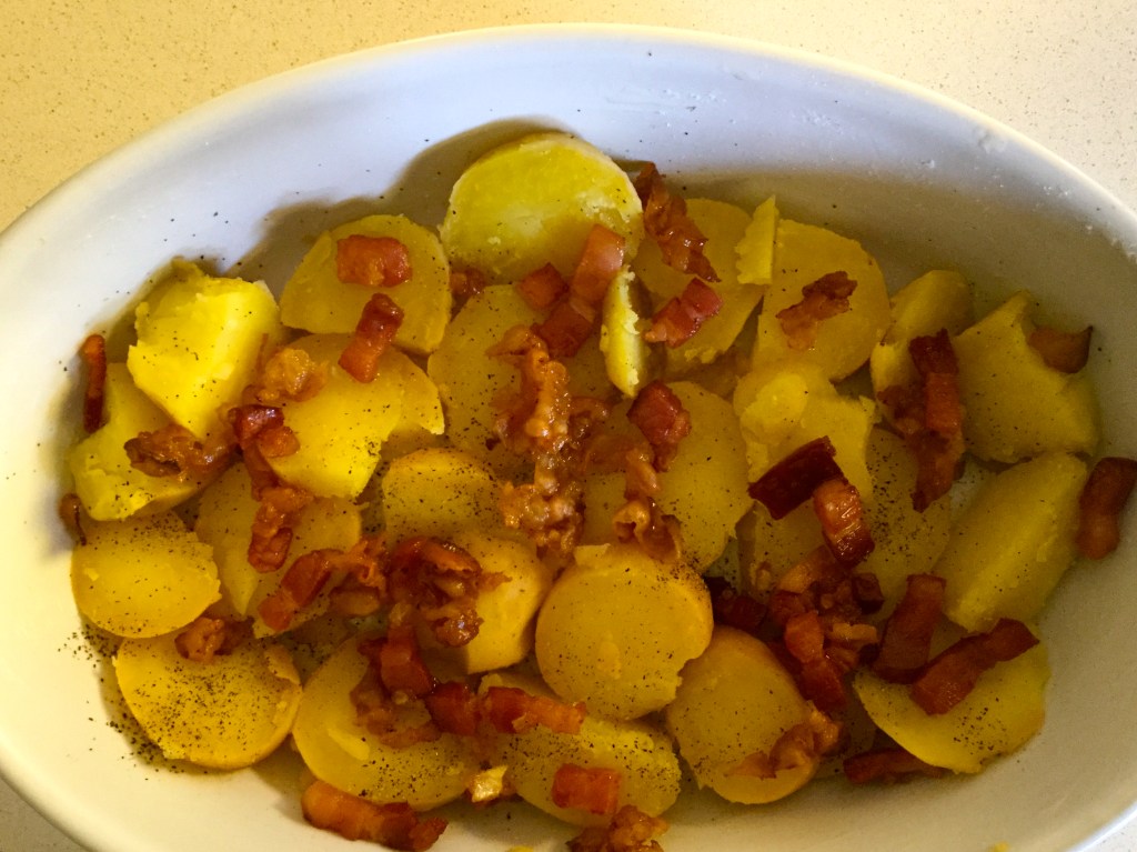 Patate rosse pronte al germoglio, un avanzo di formaggio spalmabile, quattro fettine tristi tristi di lardo di Colonnata dimenticato in frigo, mezza cipolla ancora più triste, una confezione di pancetta affumicata a dadini.