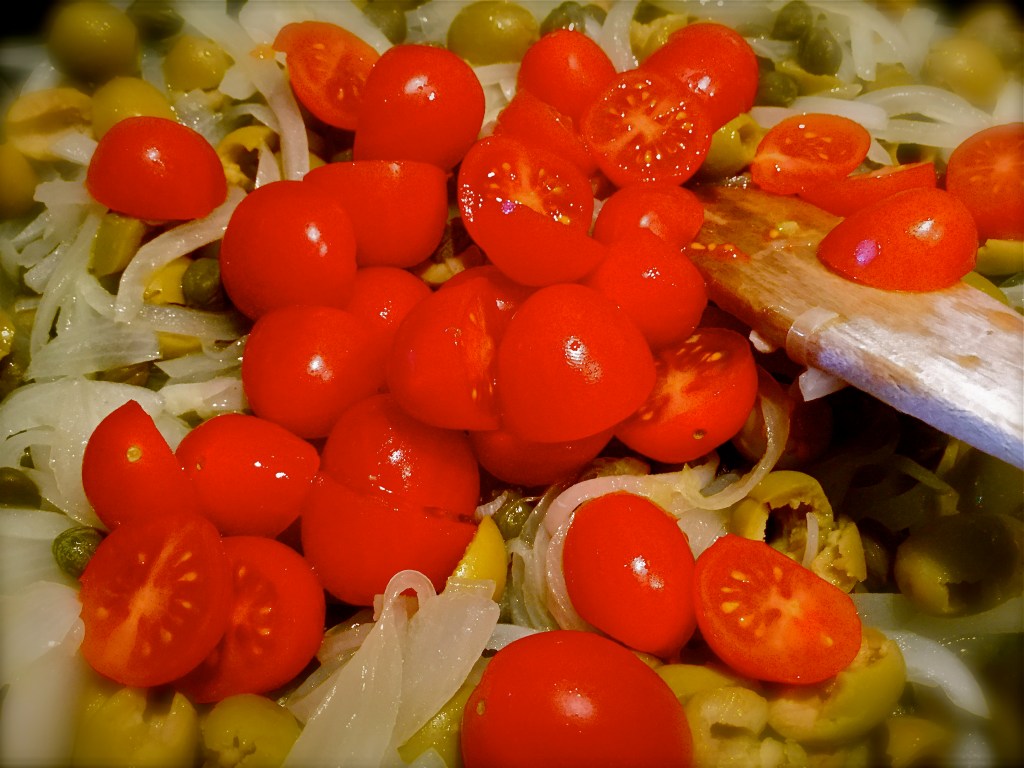 Intanto che l’olio arriva alla temperatura giusta per friggere, in una padella mettete qualche cucchiaiata di olio extra e le cipolle tagliate a fettine sottili. Quando cominciano a diventare trasparenti unite i capperi e le olive e fate andare per qualche minuto. Ora potete aggiungere i pomodori tagliati in due e il sale. Abbassate il fuoco e fate andare.