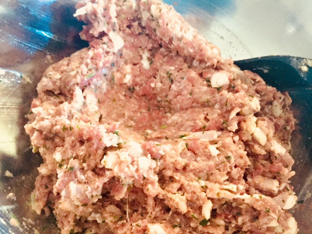 Mentre lessate le piccole uova, in una grande ciotola mettete il macinato, tutte le spezie e il trito di aglio, prezzemolo e cipolla, la pancetta e amalgamate per bene.