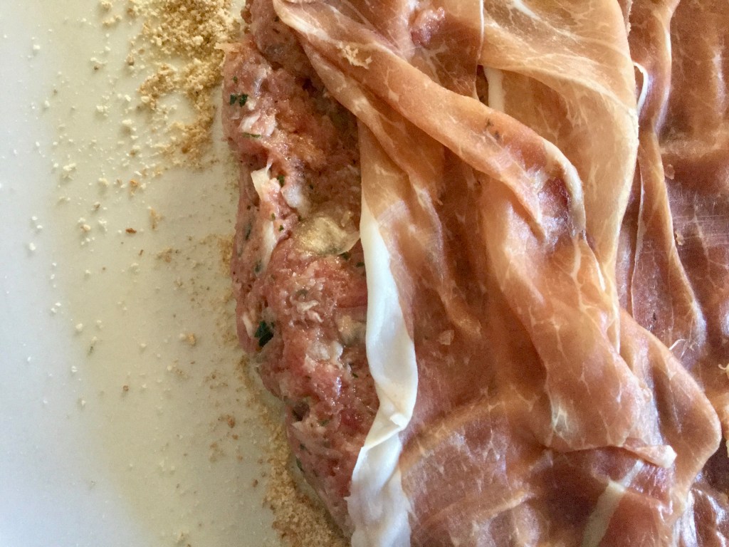 Dividete l’impasto in quattro parti. Ogni parte diventerà un piccolo polpettone. Spianatelo tipo pizza sul piano, adagiate due fette di prosciutto e due delle uova piccole e sode schiacciandole delicatamente con il palmo della mano.