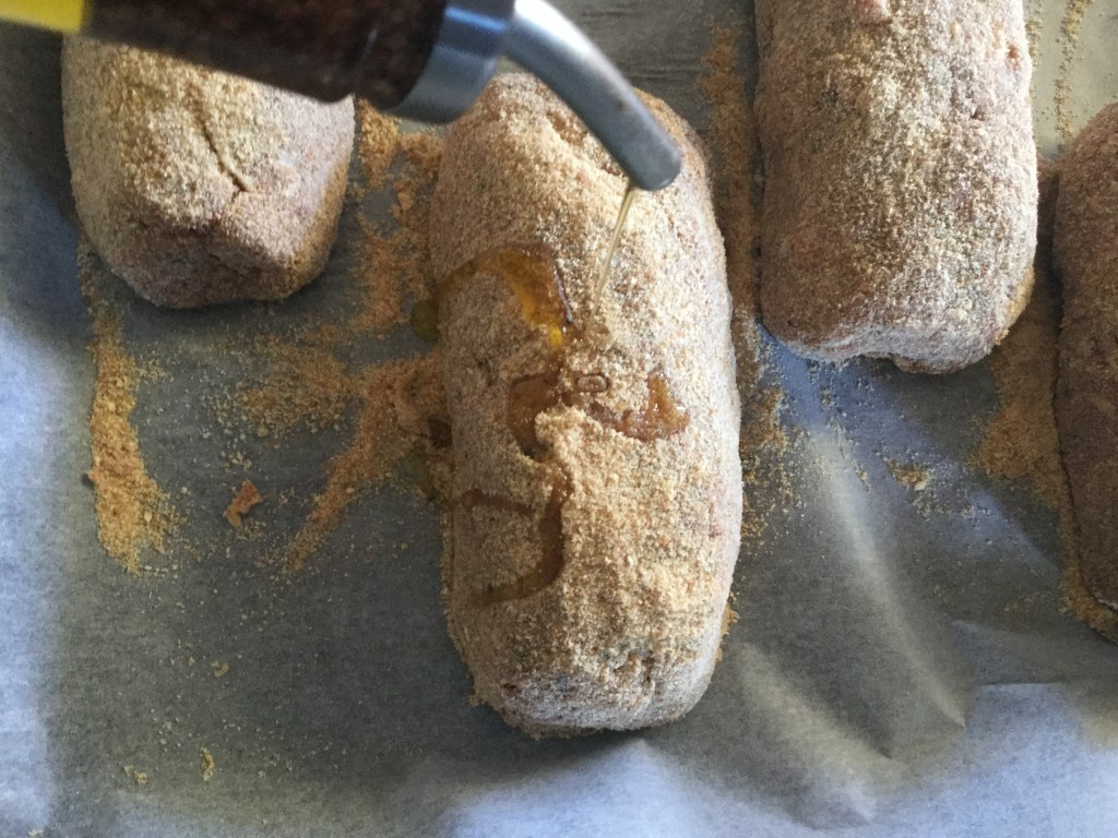 Ora con calma e delicatezza richiudete come un involtino, pressando e compattando il polpettone. Passatelo nel pan grattato in ogni sua parte. Sistemate i 4 polpettoncini ottenuti in una teglia foderata di carta forno. Irrorate con un filo d’olio extravergine d’oliva e mettete in forno a 200 gradi sino a che siano ben dorati. A metà cottura dovrete girarli affinché siano dorati sopra e sotto. Pronti!
