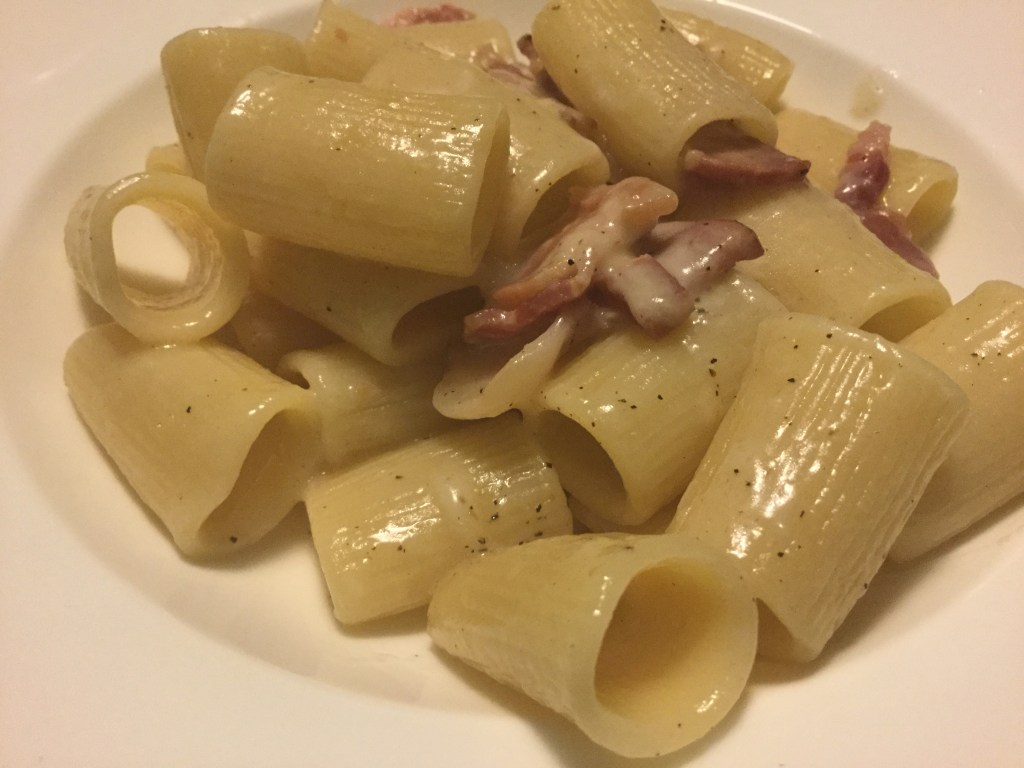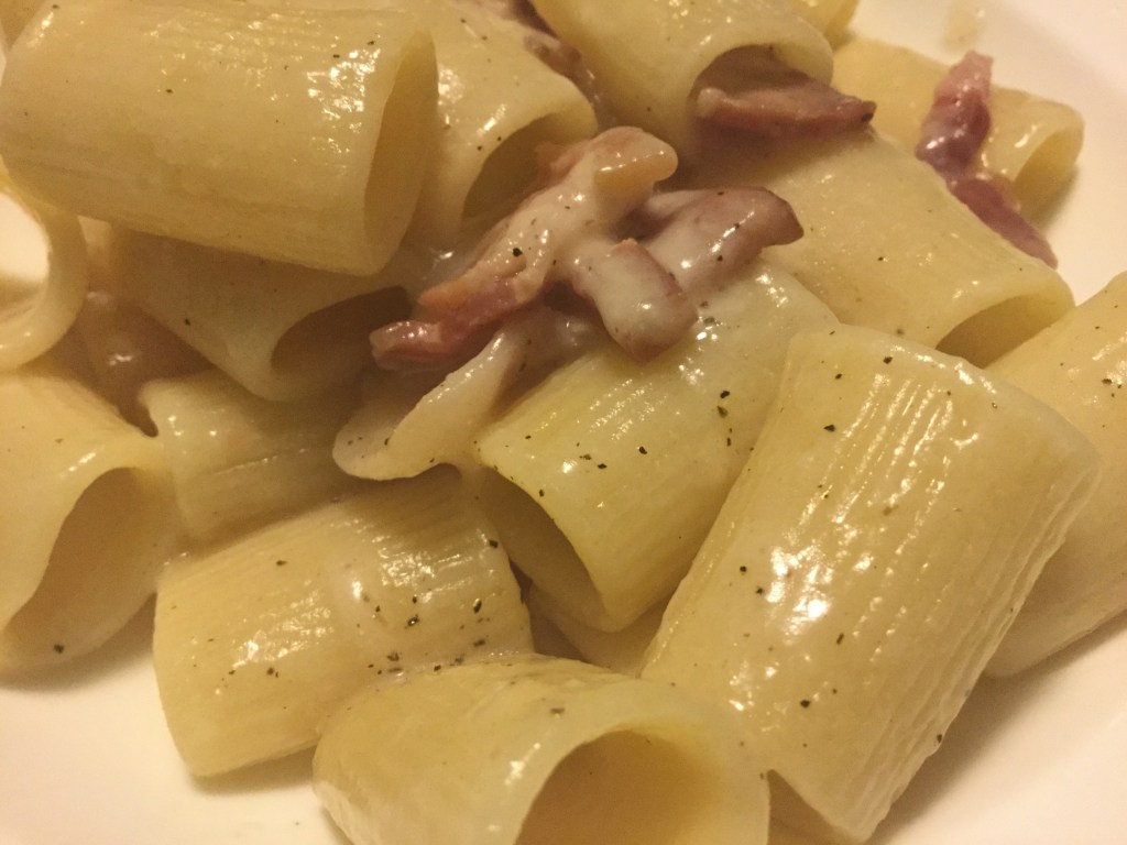 Un piatto di pasta fatto bene può cambiare la mia giornata. Non ho grandi preferenze, basta che sia fatta con tutti i crismi. Stasera la dolce metà, non capita spesso, l’ha richiesta: come dire di no? Ho aperto il frigo è ho visto un avanzo di pecorino che gridava vendetta, perciò faccio una grigia. Non darò dosi, credo che ognuno sappia il suo. L’unico punto fermo per me sono i rigatoni e il guanciale. Poi certo il pecorino, ma poco stagionato, romano o no per me non ha importanza. Non bruciare il guanciale e conservare l’acqua di cottura della pasta che con i suoi amidi formerà quella cremina deliziosa. Punto.