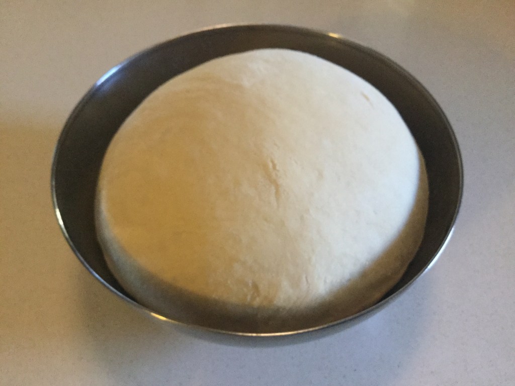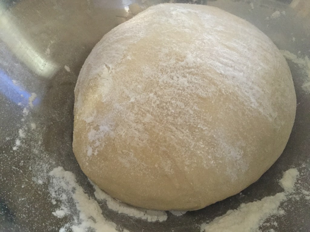 Finito di inglobare tutti questi ingredienti ho cominciato ad aggiungere il burro poco per volta perché venisse assorbito bene. Ho continuato a fare andare l’impastatrice a media velocità per almeno 10 minuti. Quando l’impasto è diventato omogeneo e cominciava a salire sul gancio l’ho tirato fuori. L’ho impastato velocemente con le mani, ne ho fatto una palla. Coperto in una grande ciotola con la pellicola l’ho messo a lievitare sino al raddoppio.