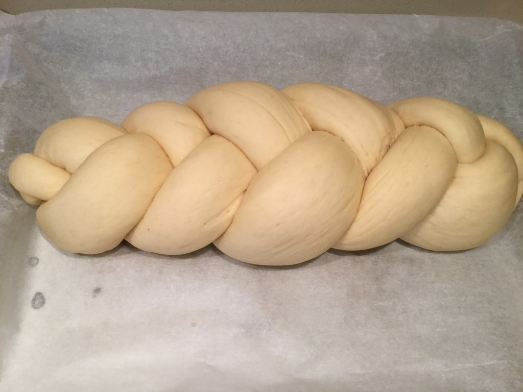 Ho sgonfiato l’impasto sulla spianatoia e poi diviso in due. Ora dovrei provare a fare la treccia come deve essere ma ho gente a cena e non ho tempo, quindi faccio una treccia normale ma molto stretta e alta.