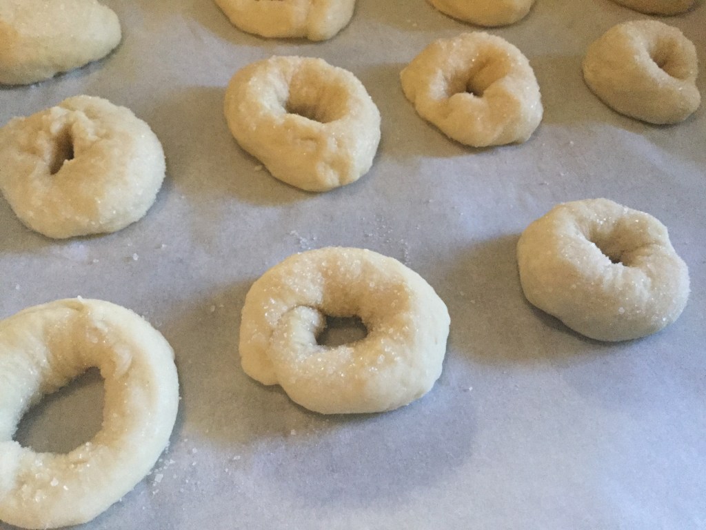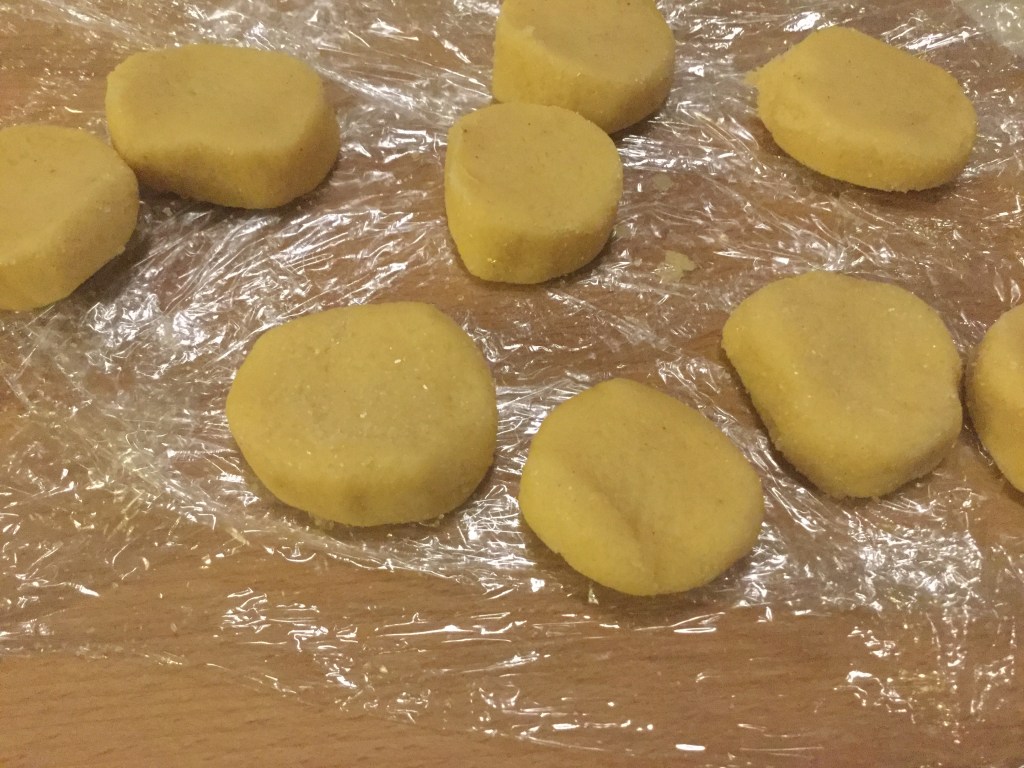 Ho ripreso i cilindri dal frigo e con un coltello affilato ho ricavato da ognuno una decina di ‘bottoni’ che ho sistemato, ben distanziati, nella teglia foderata di carta forno. Ho infornato per circa 10 minuti a 180 gradi.