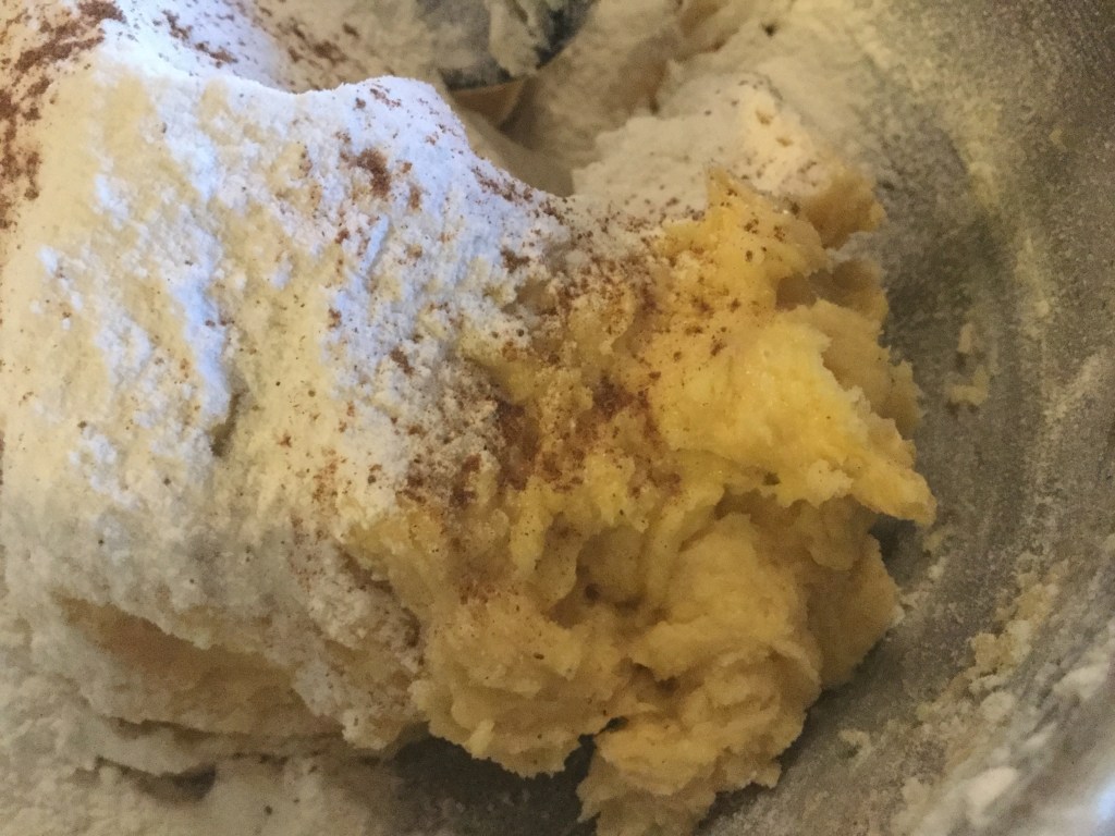 Ho lavorato con il frullino il burro morbido con lo zucchero sino ad ottenere un impasto montato. Ho aggiunto, sempre frullando, i tuorli, uno alla volta per farli assorbire bene. Ho setacciato la farina con il lievito, ho aggiunto la cannella e poco per volta l’ho impastata al composto con il burro. Appena possibile ho trasferito l’impasto sulla spianatoia sino a che tutta la farina è stata assorbita.