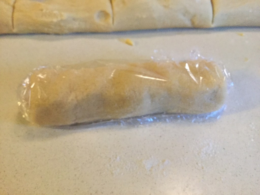 Ho diviso in 5 pezzi l’impasto e ne ho fatto 5 cilindri che ho prima rotolato nello zucchero semolato e poi impacchettato con la pellicola. Li ho messi in frigo per un ora.