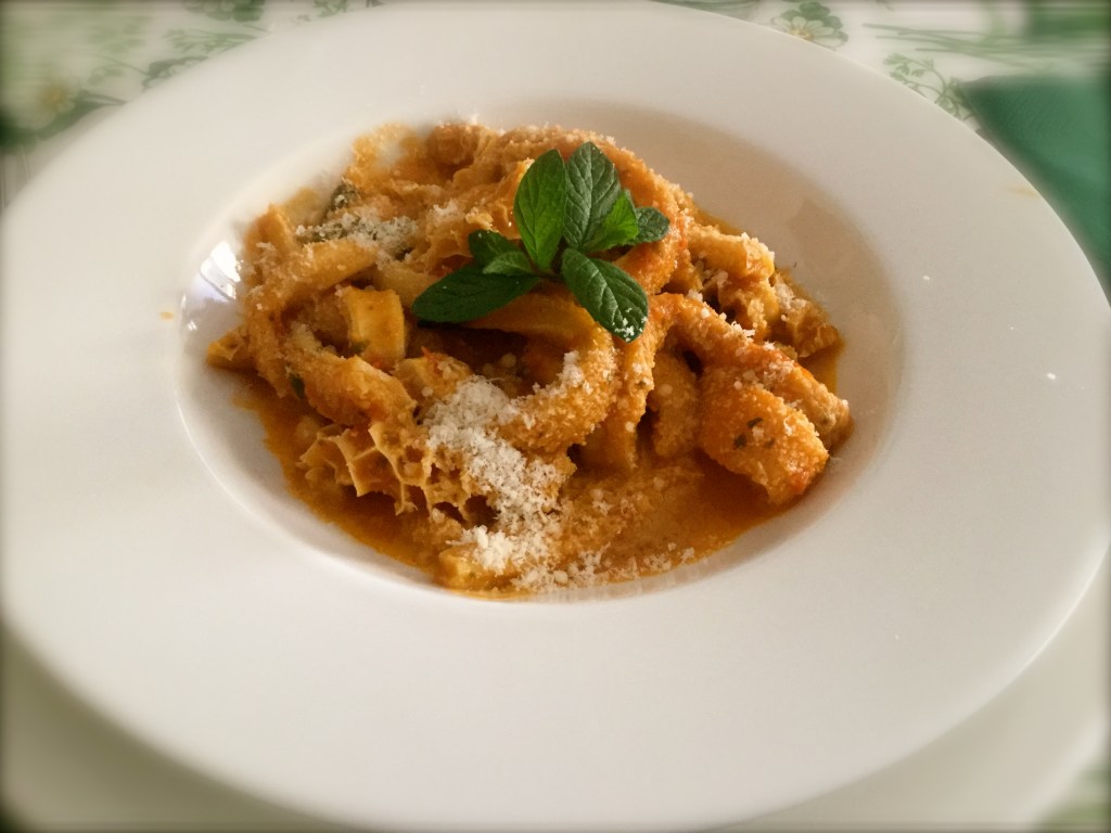In una pentola media metto il sugo che ho già pronto, la trippa affettata sottile e risciacquata ulteriormente, accendo il fuoco e ….ciao. Giro ogni tanto perché non si attacchi nulla. Dopo 20 minuti circa spengo il fuoco, trito una bella manciata di foglie di menta fresca, una girata e il piatto e pronto. A tavola ci sarà il parmigiano da aggiungere come si fa con la pastasciutta!