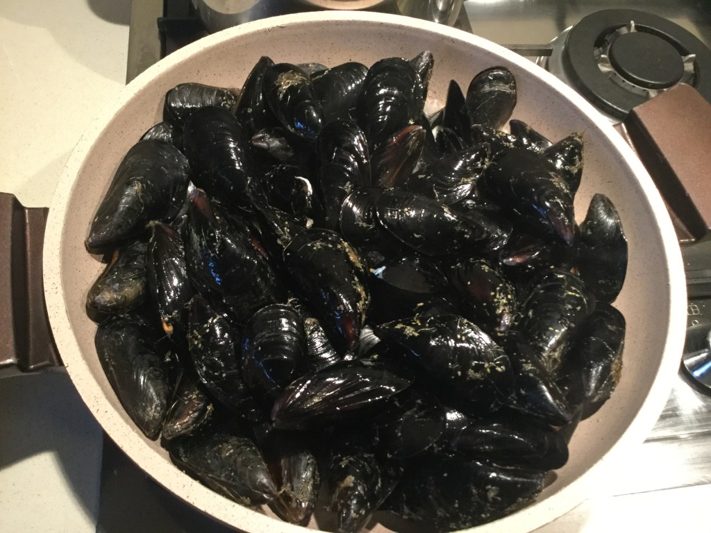 In una padella capiente verso poco olio con 2 spicchi d’aglio e qualche ciuffo di prezzemolo. Appena l’aglio comincia a colorarsi aggiungo le cozze, copro con il coperchio e a fuoco vivace aspetto che si aprano.