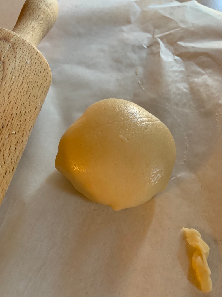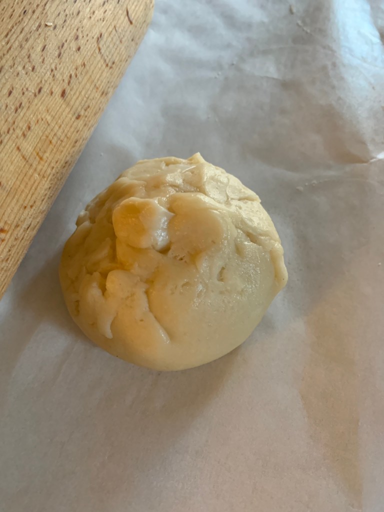 ……per dirmi che stava facendo una pausa dallo studio. Perciò armata di tanta buona volontà, visto che non lo avevo mai mangiato, ho deciso di mettere le mani in pasta e ho cominciato. Per la parte ‘biscotto morbido’ tutto bene, niente di complicato. Ma quando ho cominciato a impastare la parte ‘tipo brioche’ ho cominciato a disperare……ma quanto devo impastare? Si staccherà mai dalla spianatoia?