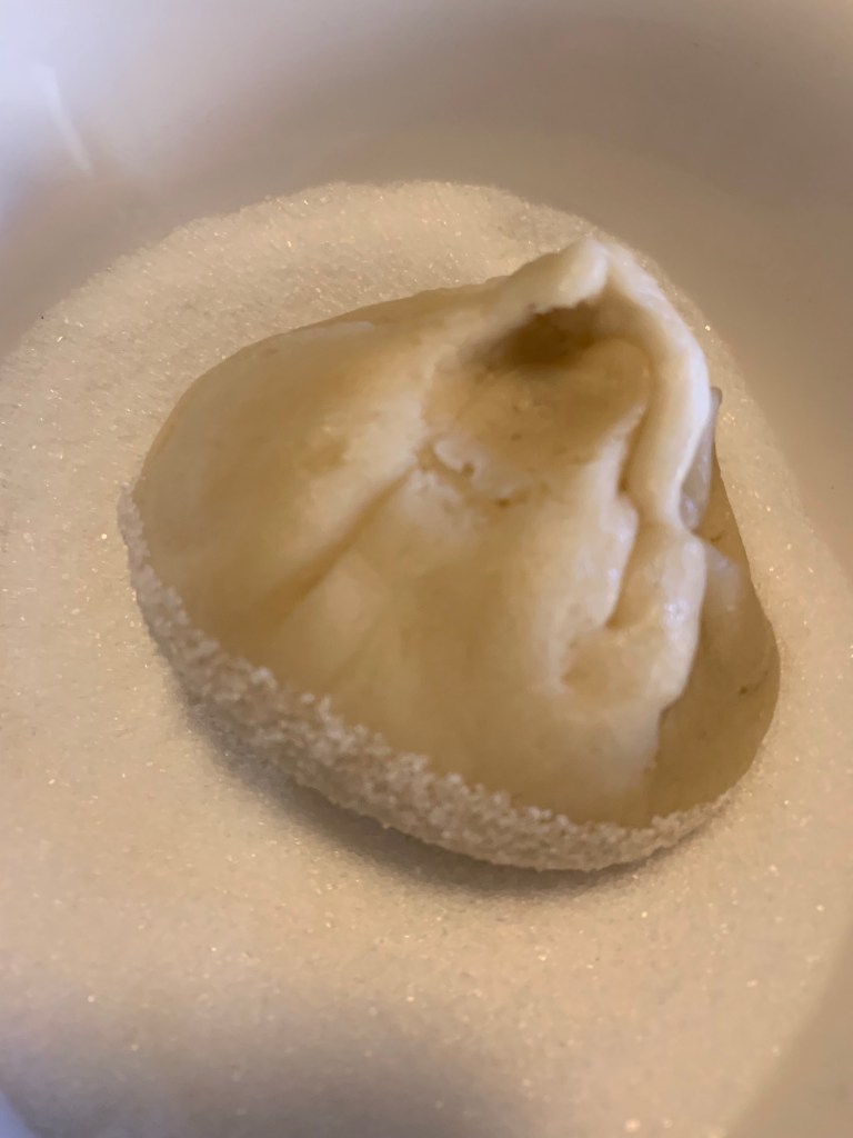 L’ho steso tra due fogli di pellicola sino ad uno spessore di circa 3cm. e ne ho ricavato 5 dischi. Ora viene il bello….. praticamente ogni disco deve ricoprire la pallina ‘tipo brioche’. Quindi aiutandomi con la pellicola, delicatamente ho foderato le palline quasi completamente e ho passato la parte superiore nello zucchero semolato.