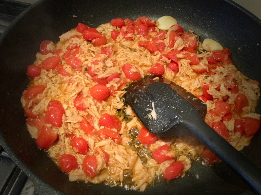 A questo punto ho scolato il tonno, l’ho sminuzzato con le dita e unito al sugo. Ho fatto cuocere per altri 5 minuti. Ho spento il fuoco ed aggiunto la scorza di limone grattugiata. Pronto.