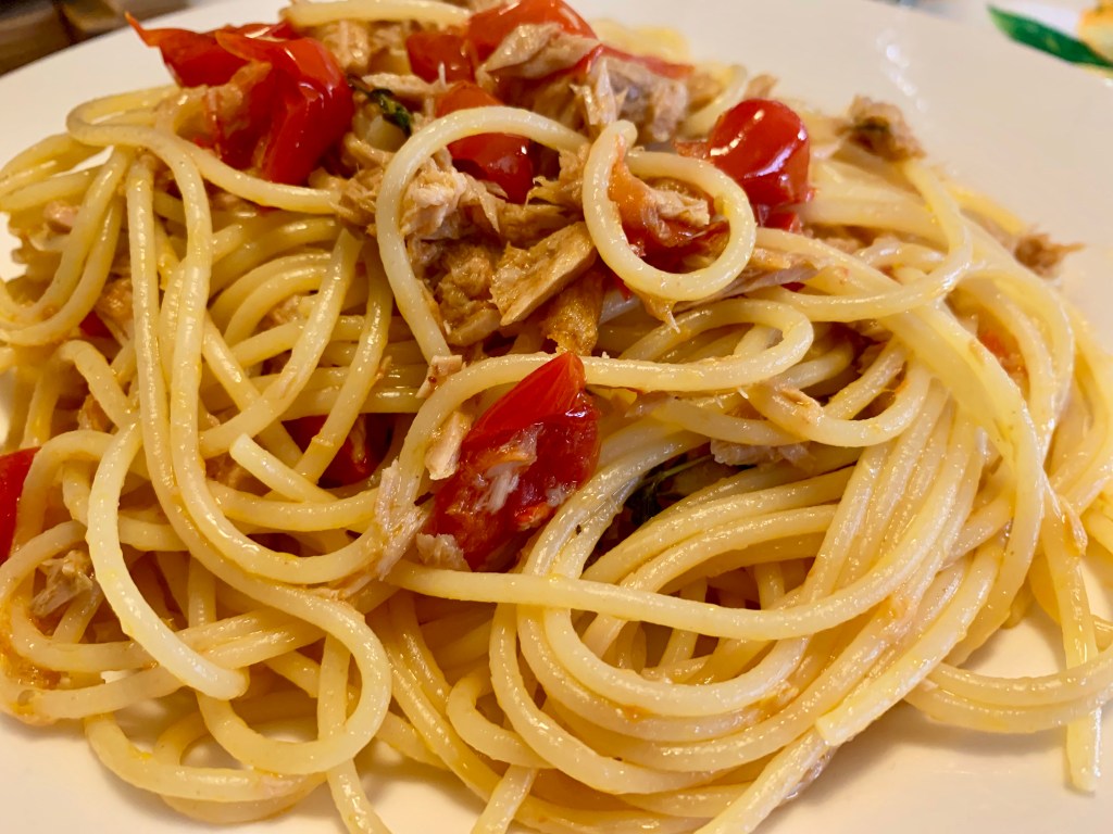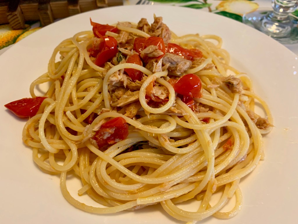 Oggi ho preparato gli spaghetti al tonno, a modo mio. Il sugo lo preparo mentre l’acqua per la pasta bolle, una bella insalata e frutta fresca ed il pranzo è risolto. Al mercato ho trovato i pomodori datterini, la maggiorana in terrazza è rigogliosa e i limoni non mi mancano….quindi…..