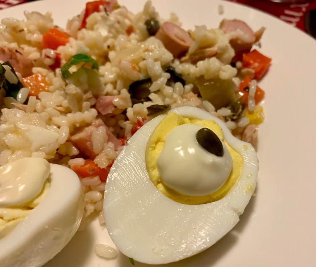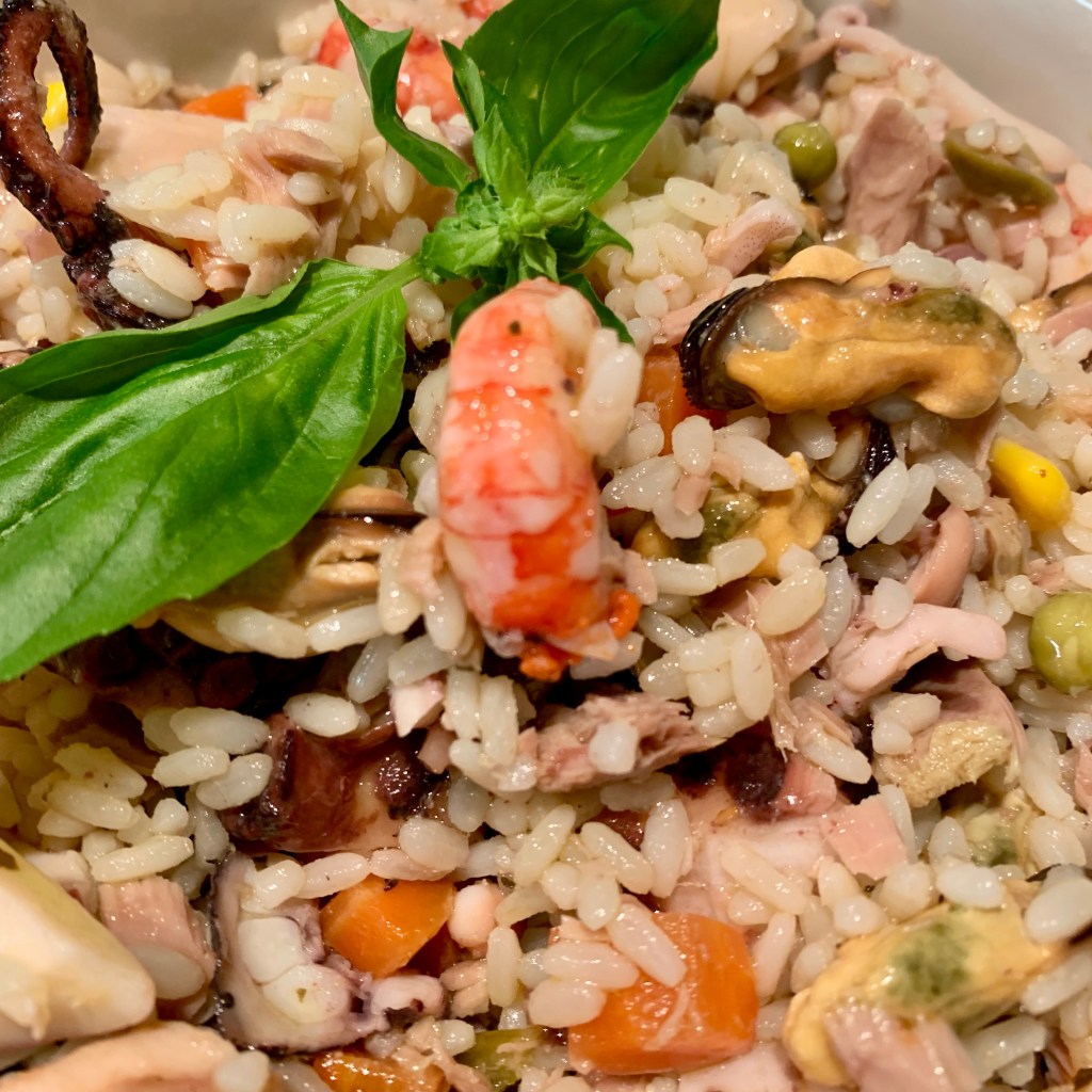 Quando il pescivendolo mi prepara i frutti di mare già cotti pronti da condire faccio l’insalata di riso, ma di mare. Arselle, cozze, gamberi e calamari semplicemente scottati in acqua e poi conditi con olio e aceto e poco sale. Li metto con il riso al posto dei formaggi, dei würstel e del prosciutto cotto. E’ una variante molto succulenta alla classica ricetta. Provatela e mi direte!!