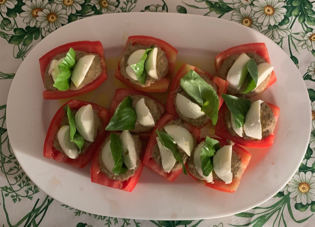 Ho tagliato in quattro ogni bocconcino ed ho affondato due pezzi per ogni pomodoro, ho guarnito con il basilico ed ho fatto un giro d’olio extra vergine d’oliva. Ho messo in frigo sino al momento di servirli!