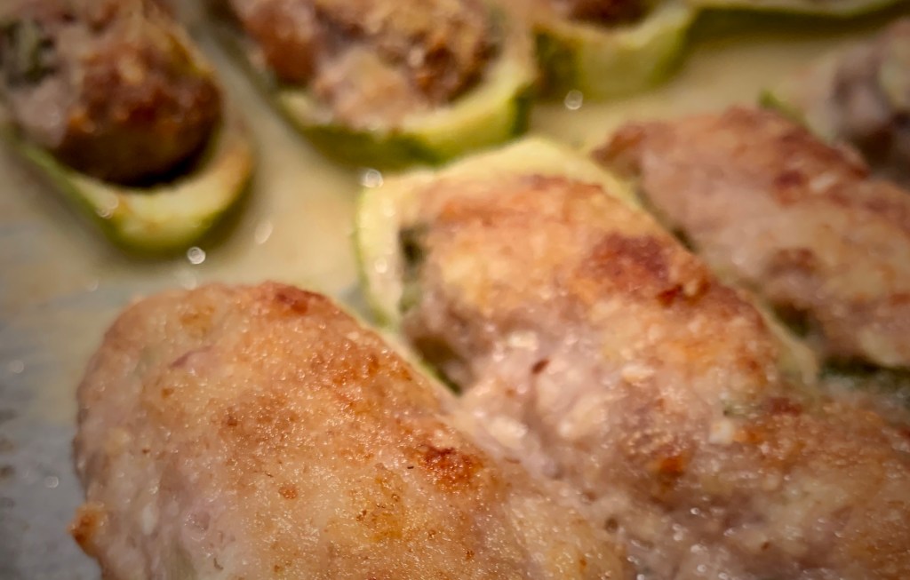 Faccio sbollentare per 5 minuti circa le zucchine tutte intere. Intanto con le mani ‘impasto’ la carne con il trito di aglio e prezzemolo, sale e pepe, il prosciutto, meglio se frullato, e il parmigiano. Quando le zucchine si sono leggermente ammorbidite le scolo dall’acqua, le taglio a metà e con lo scavino le svuoto.