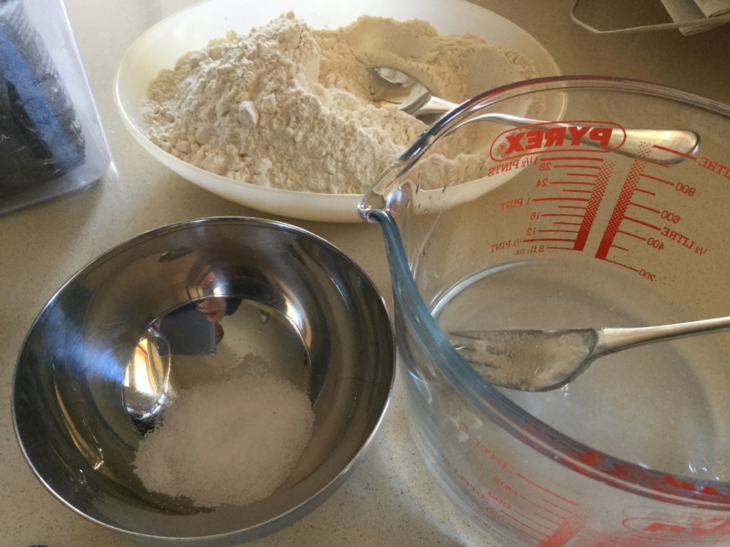 Per prima cosa ho preparato tutti gli ingredienti sulla spianatoia. Poi in una ciotola ho messo tutto il lievito poco meno della metà della farina e ho miscelato parte dell’acqua con una forchetta, sino ad ottenere un piccolo impasto molto molle (lievitino). L’ho messo in forno spento per circa un ora sinché è raddoppiato e ha fatto le bolle.