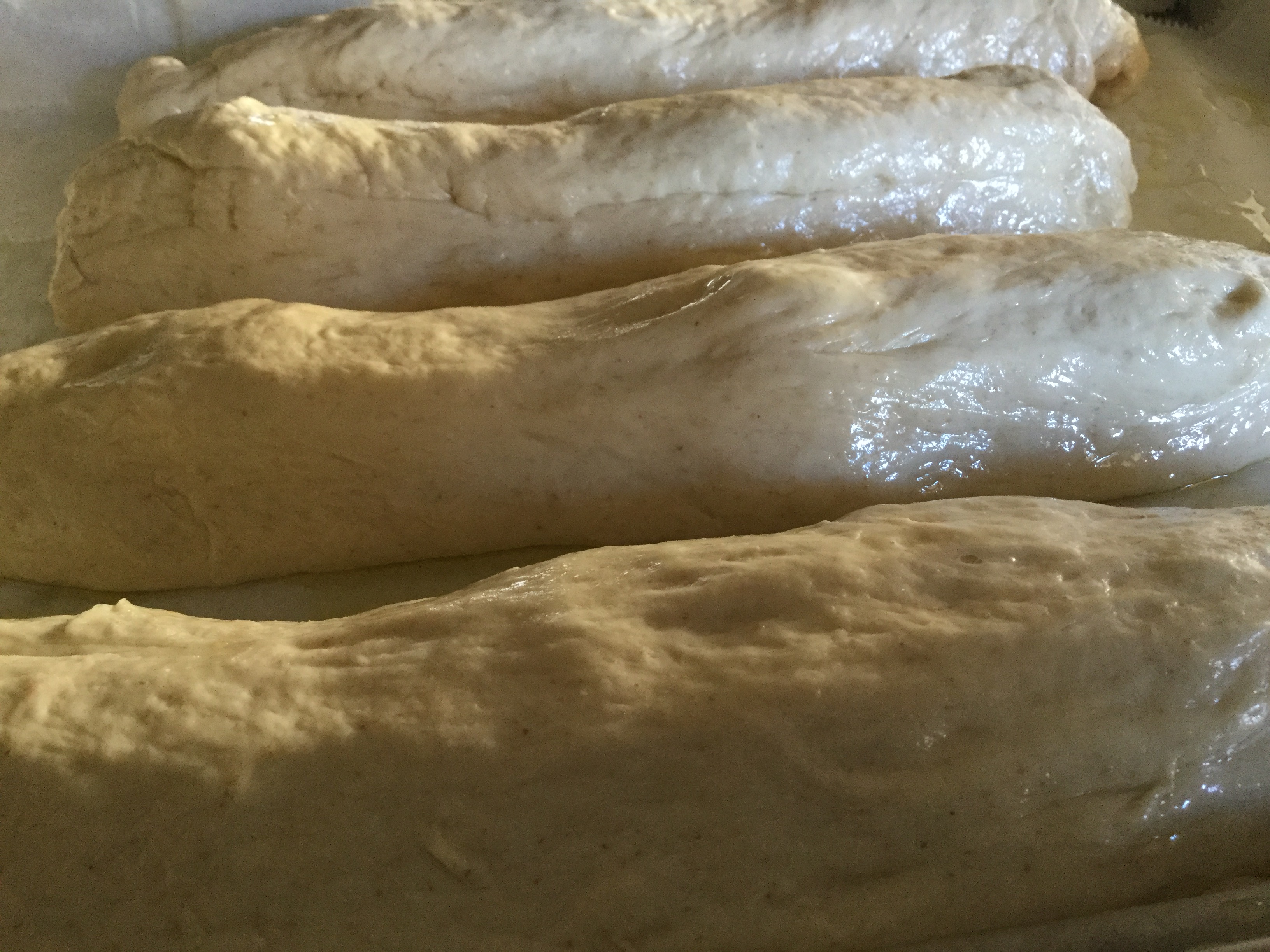 Ho formato le quattro baguette, più o meno, le ho messe nella teglia foderata di carta forno e ho aspettato che raddoppiassero per l’ultima volta.