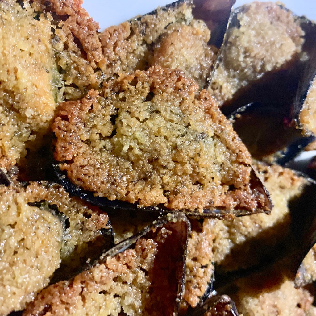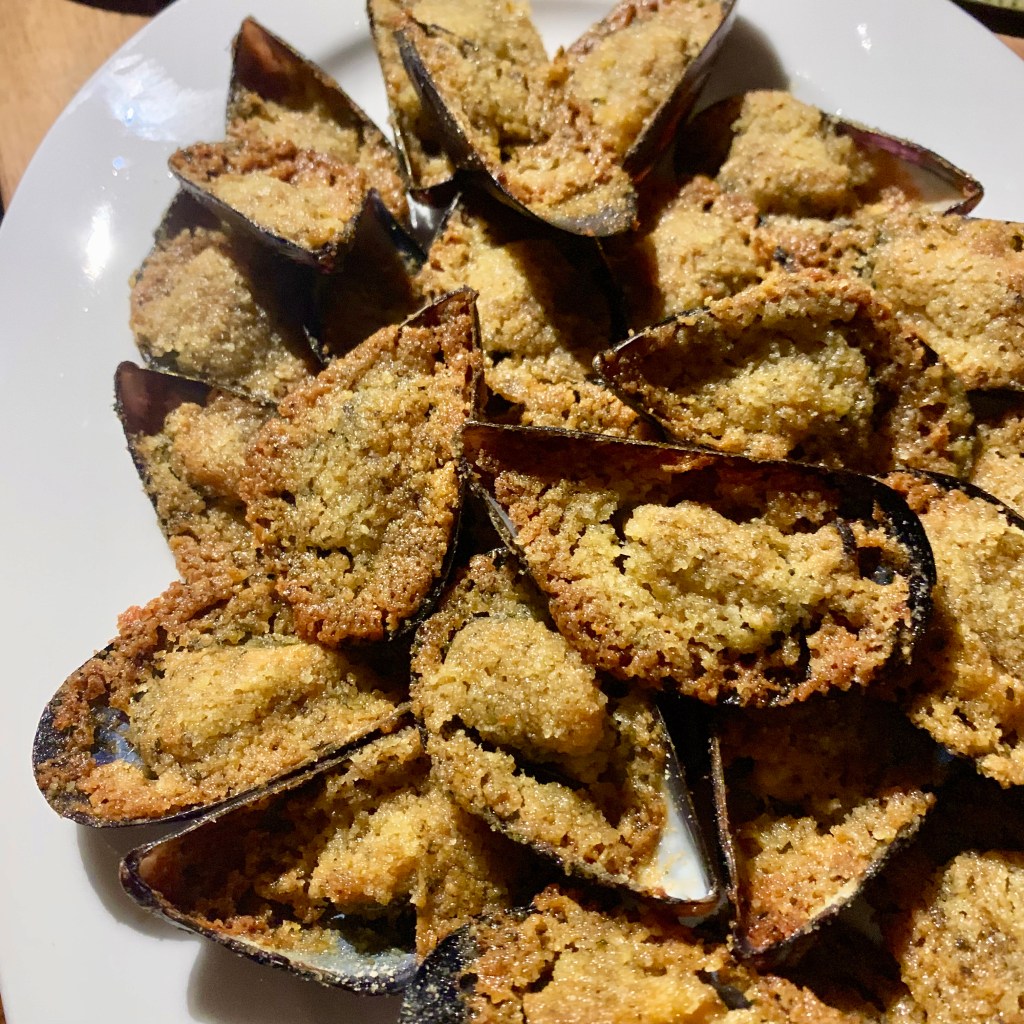 Dopo averle ben spazzolate e private del filo barboso che le tiene chiuse, le faccio socchiudere in pentola con un filo d’olio e qualche spicchio d’aglio. Solo dopo le divido, conservando la loro acqua, e le dispongo sulla teglia foderata di carta forno. Dopo diversi tentativi ho trovato la farcia perfetta per me, che lascia comunque il gusto del mare intatto. Ha in superficie un bello strato croccante, dato dal parmigiano, che sigilla tutto senza però coprire il gusto delizioso del frutto di mare.