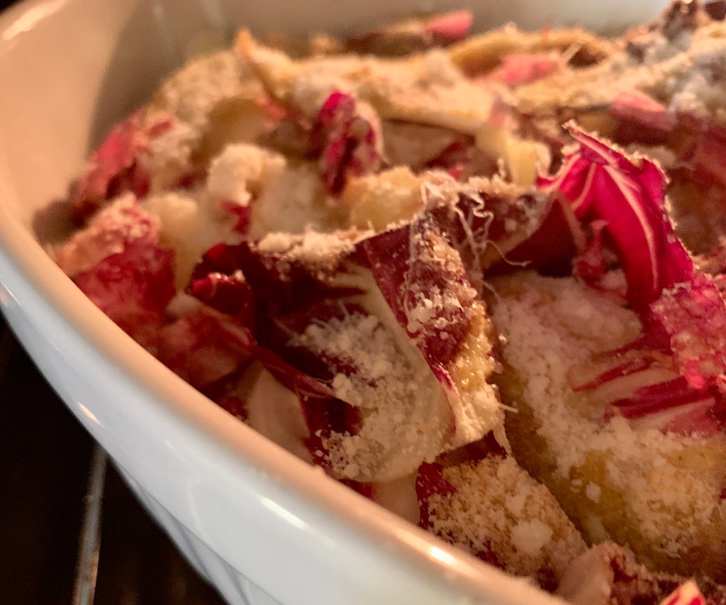 Ho lavorato con la spatola la ricotta e le acciughe. Ho unto il fondo di una pirofila. Ho staccato una o due foglie di radicchio e le ho ‘imbottite con la crema, le ho arrotolate strette e messe nella pirofila con la chiusura sul fondo.