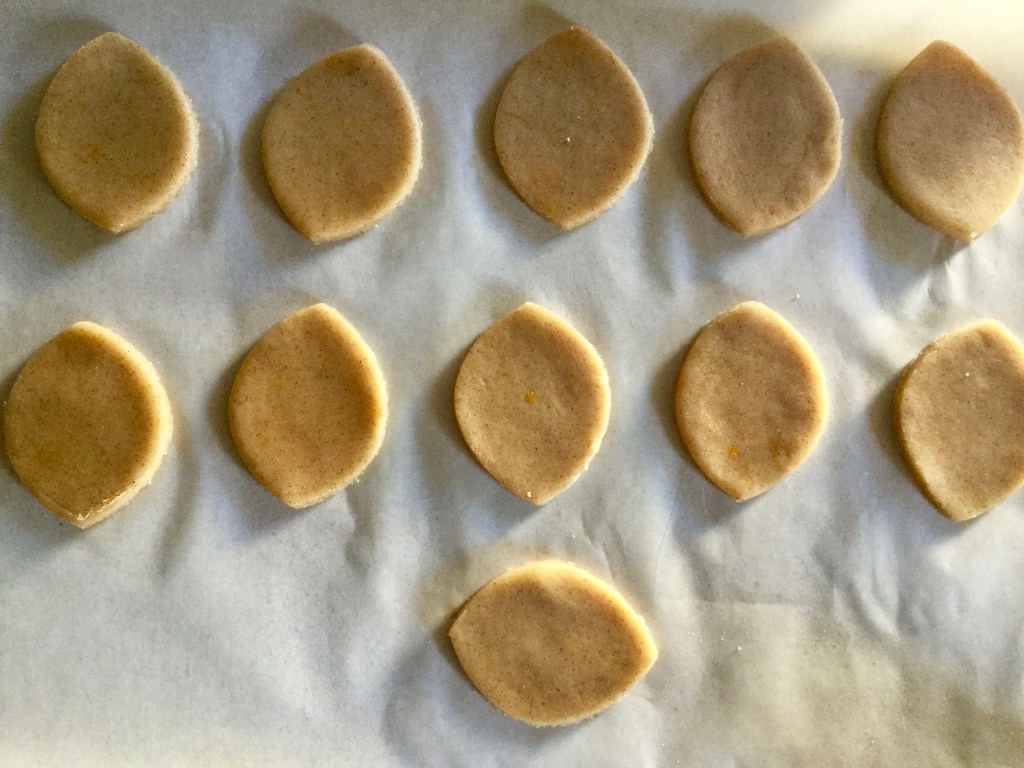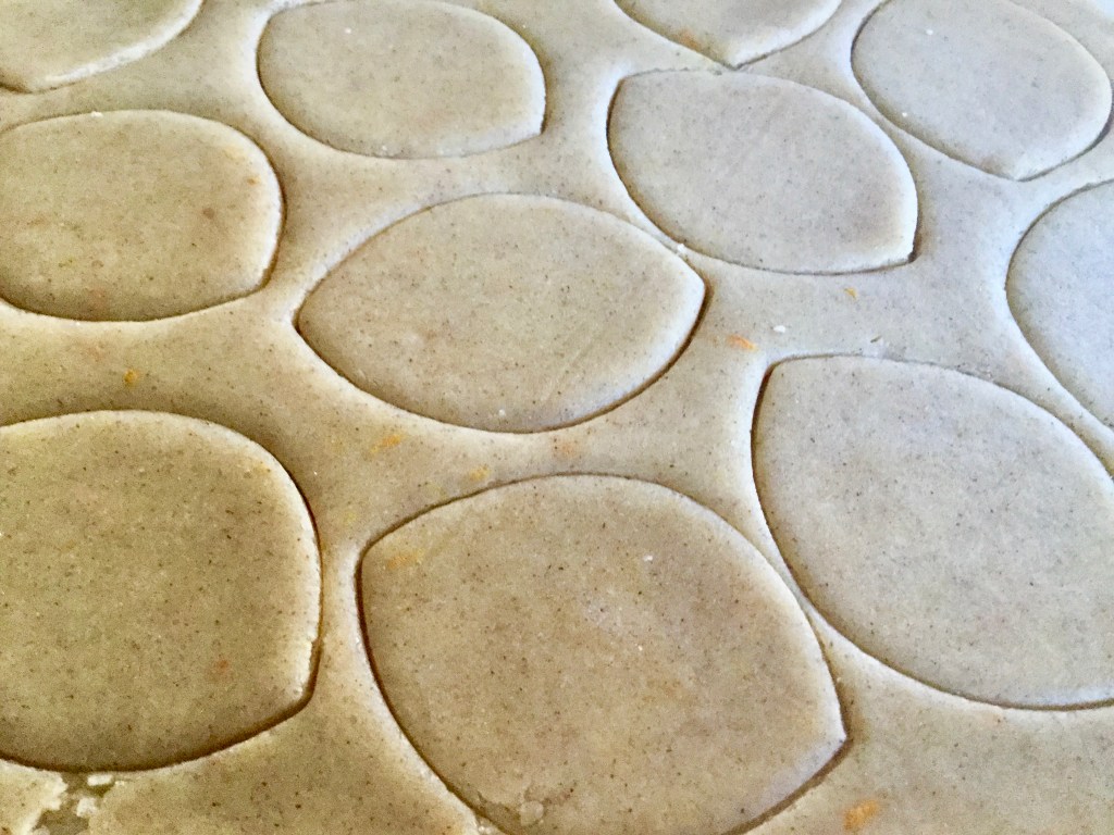Con la punta delle dita ho amalgamato il burro con la farina, poi ho unito lo zucchero, il lievito, la cannella e la scorza d’arancia. Ho impastato ancora per unire bene tutti gli ingredienti. Quindi ho aggiunto i tuorli d’uovo impastando con le mani nella spianatoia. Ottenuto un impasto compatto ho fatto una palla. Ora si dovrebbe mettere in frigo, ma io l’ho stesa, abbastanza spessa, direttamente tra due fogli di carta forno. Ho fatto le forme e sistemato i biscotti nella teglia foderata.