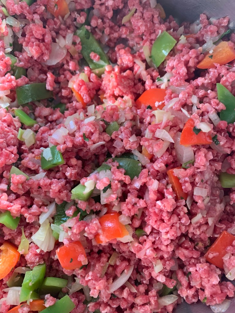 Si comincia con il soffritto di olio cipolla e aglio, poi si aggiungono i peperoni. Sale e pepe e si fa andare per una decina di minuti. Ora aggiungiamo la carne che lasceremo ad insaporirsi per altri dieci minuti.