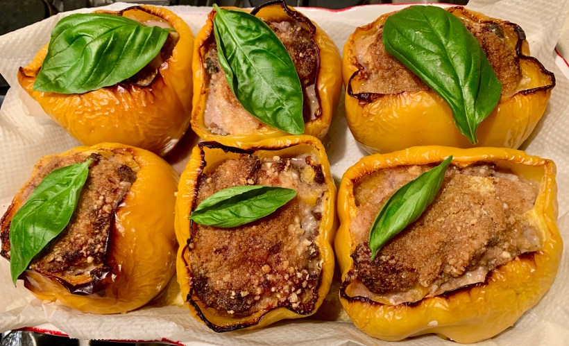 In una pirofila, foderata di carta forno, ho unto il fondo con poco olio e sistemato i peperoni. All’interno ho messo una foglia di basilico e poi il ripieno. Ho cosparso con parmigiano e pan grattato la superficie di ogni peperone ed ho infornato per 25/35 minuti a 180 gradi.