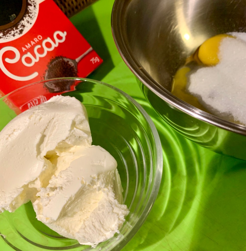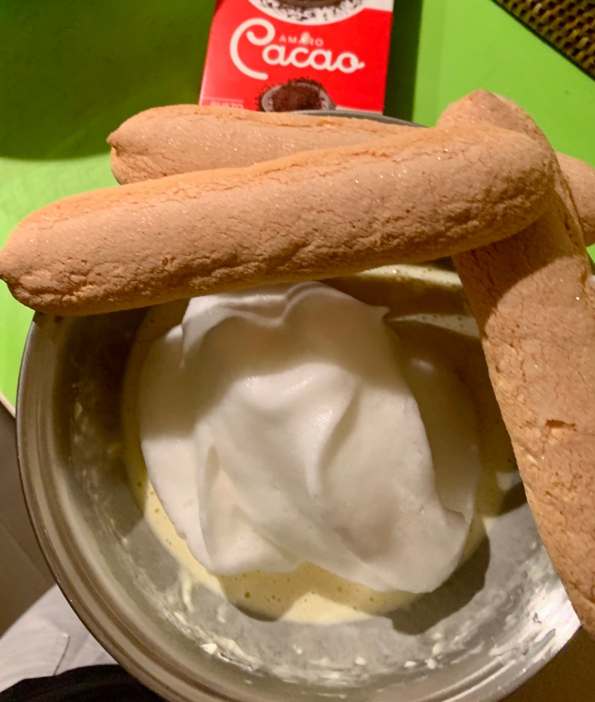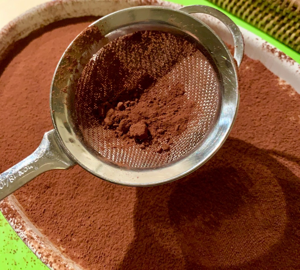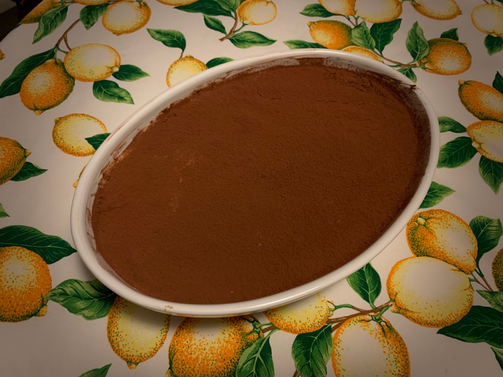 In una pirofila dispongo uno strato di savoiardi imbevuti velocemente nel caffè, ricopro con uno strato di crema, faccio un altro strato con i biscotti e ricopro bene con il resto della crema. Infine cospargo abbondantemente di cacao amaro in polvere.