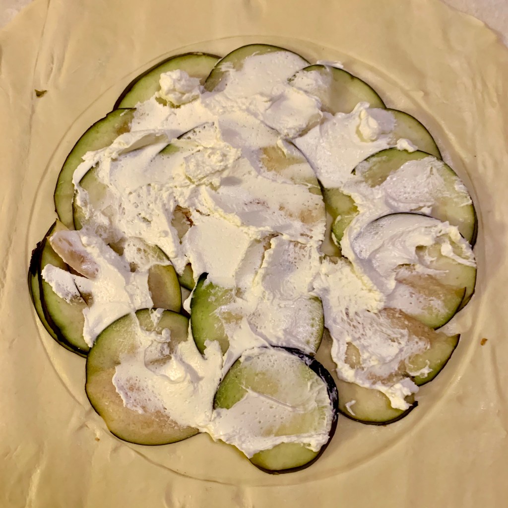 Ho srotolato sul piano la pasta sfoglia, ho preso la misura della teglia appoggiandola al centro dalla parte del bordo.Ho tagliato la melanzana a fettine sottili sottili ed ho coperto il fondo e poi sopra ho spalmato il formaggio.