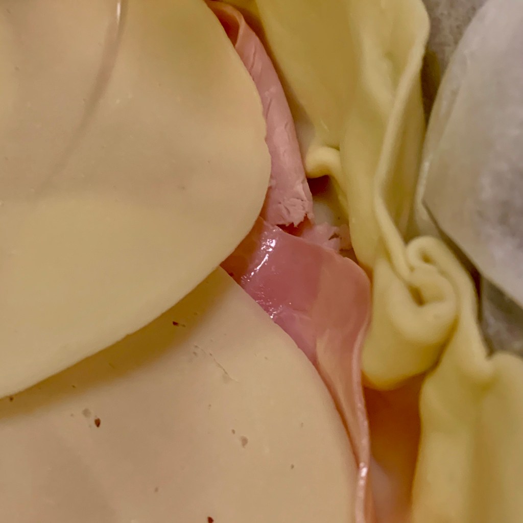 Ho acceso il forno a 180 gradi ventilato. Ho disposto la pasta sfoglia sulla teglia, ho ricoperto con il prosciutto e sopra le fettine di formaggio.