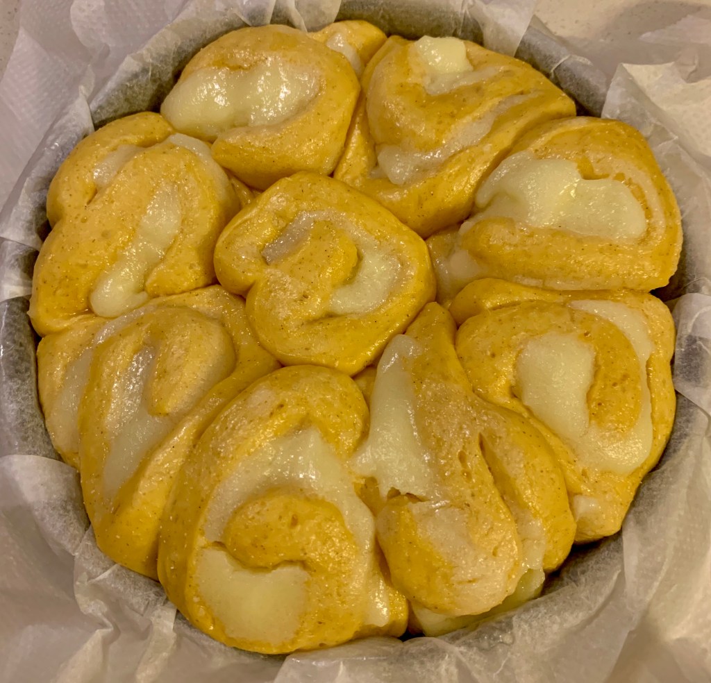 Ho disposto ‘le rose’ sulla teglia foderata di carta forno, belle strette, e ho lasciato lievitare di nuovo per circa un oretta, devono gonfiarsi quasi a scoppiare!
