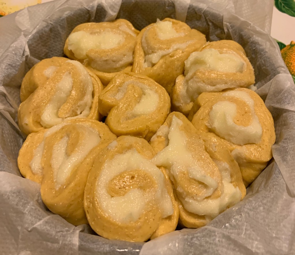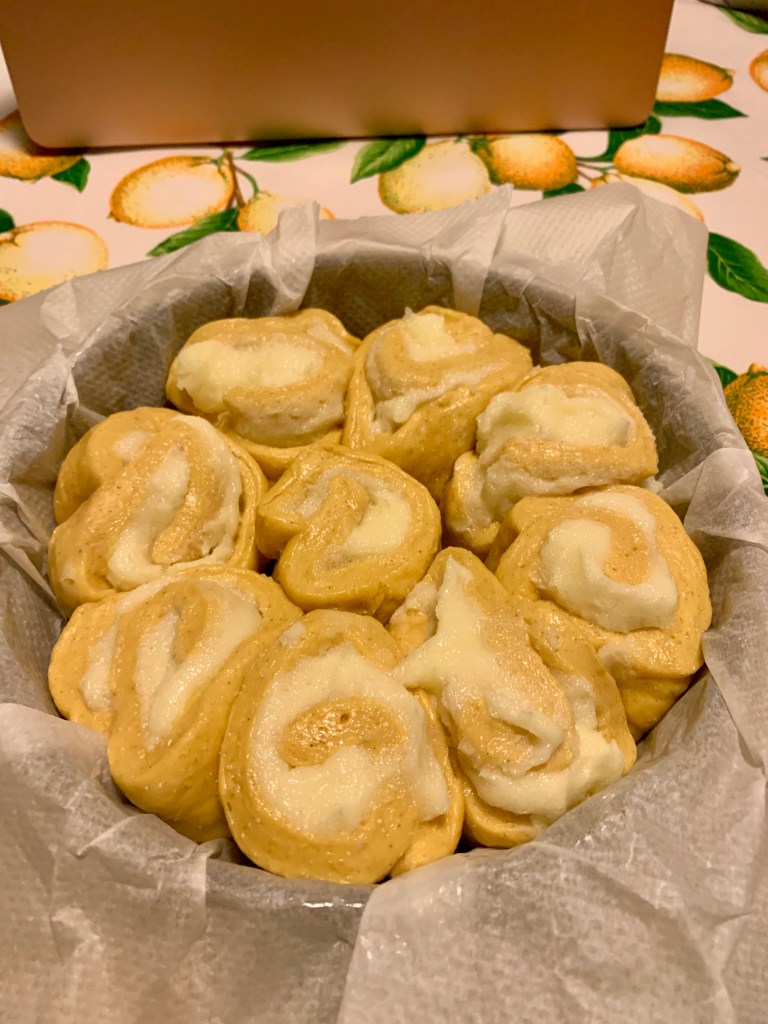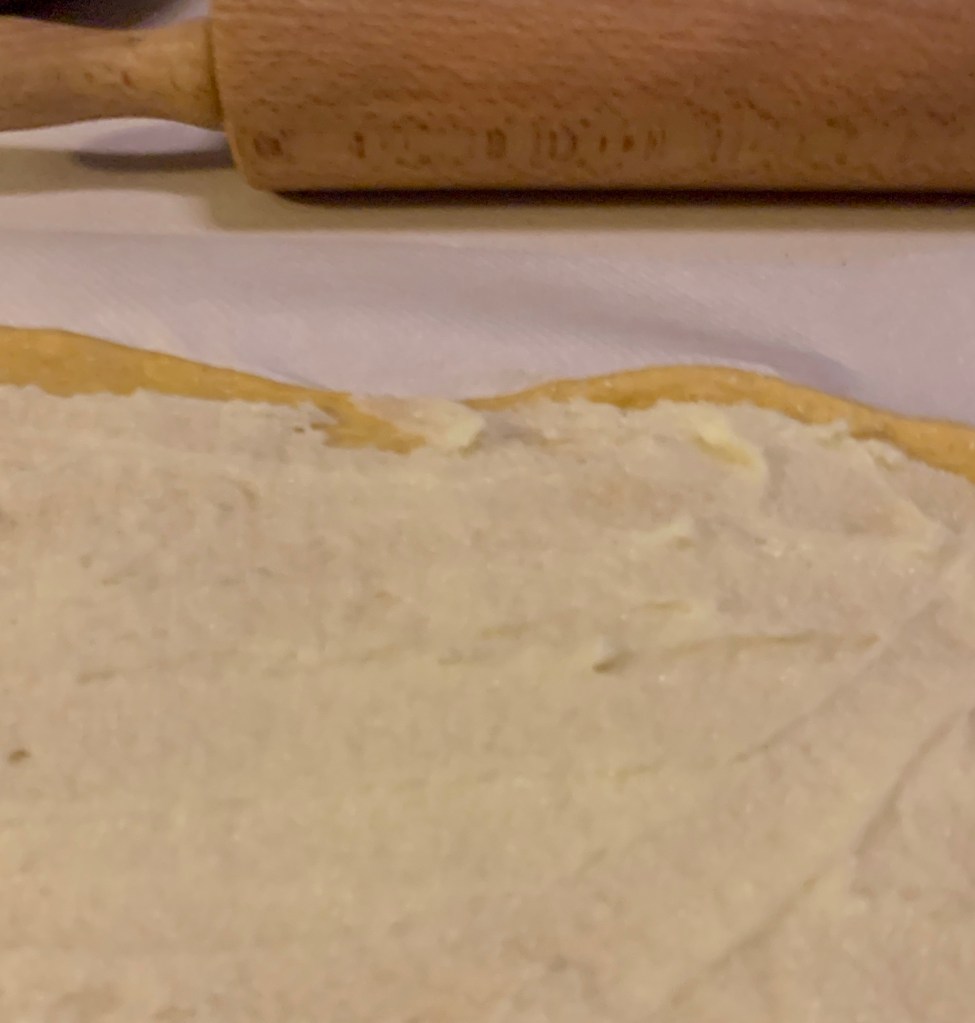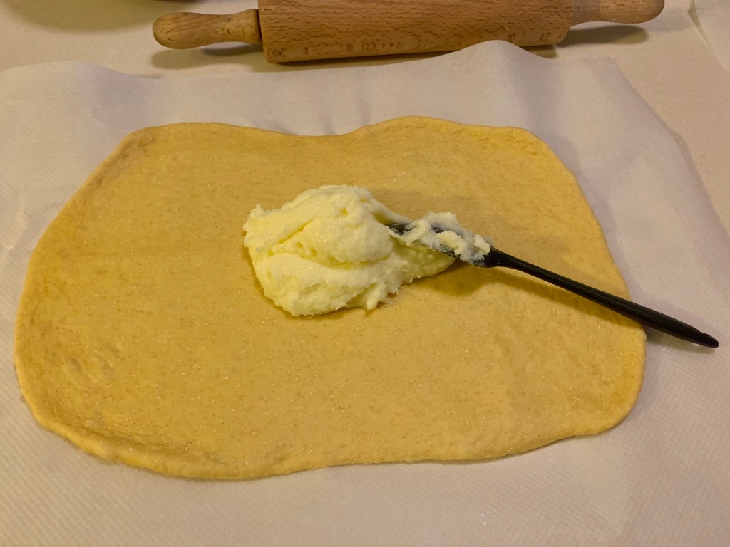 Ho steso quindi l’impasto su un foglio di carta forno cercando una forma rettangolare, ho spalmato la crema di burro e zucchero e ho arrotolato, ottenendo un cilindro che ho affettato in 9 parti.
