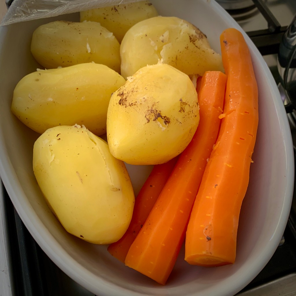 Ora metto l’acqua sino a superre di tre dita le patate e metto sul fuoco, a calore medio, con il coperchio. Passata circa mezzora tiro fuori le patate e le carote e le dispongo in una pirofila.