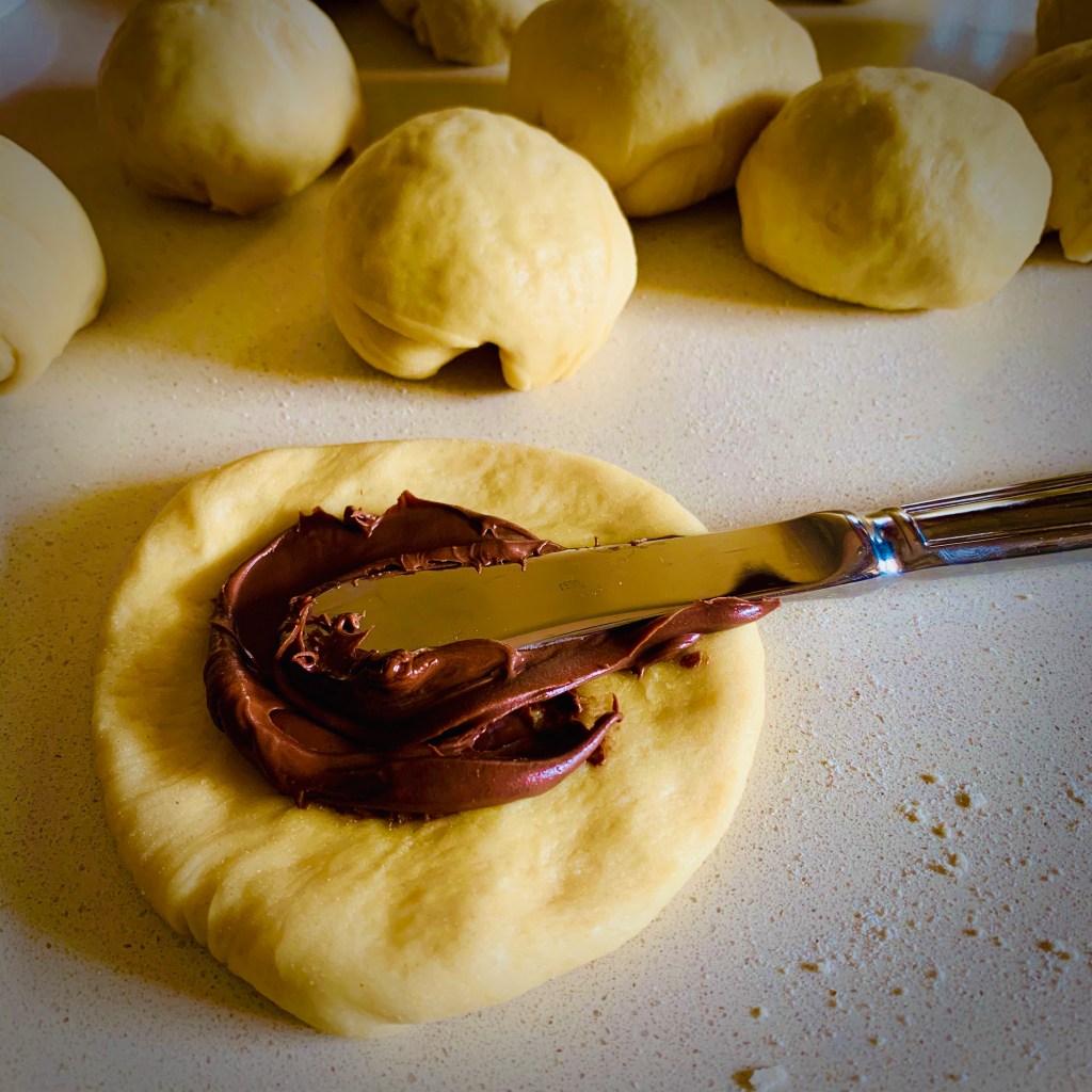 Ora dall’impasto bello gonfio ho ricavato 12 palle, le ho stese e spalmate con la nutella nella parte interna.