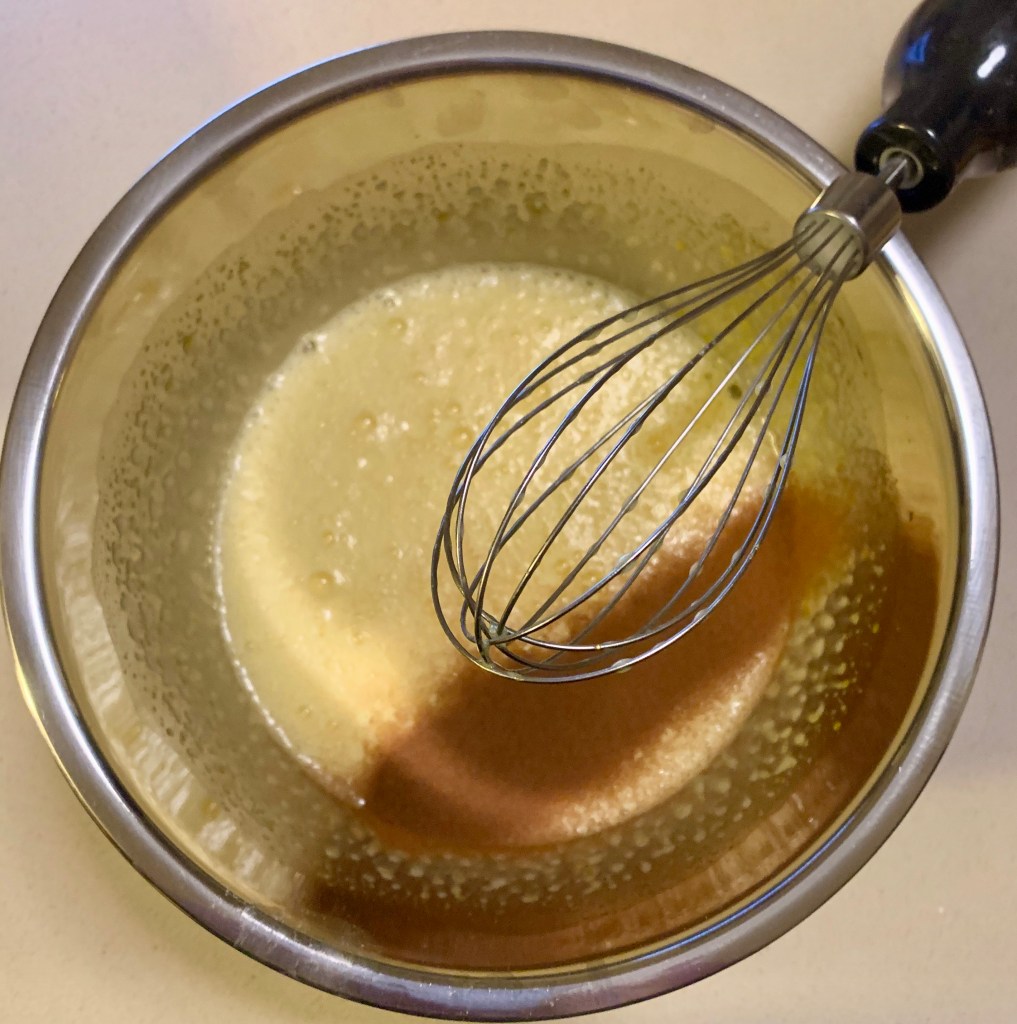 Ho montato con le fruste le uova intere con lo zucchero sino ad ottenere un impasto liquido ma chiaro e spumoso. Ho aggiunto il burro a filo dopo averlo scaldato leggermente al microonde. Ho unito la cannella e la scorza di limone continuando a frullare.