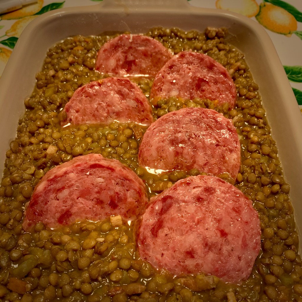 Preparo una bella pirofila da forno, dispongo le lenticchie, adagio sopra le fette di zampone e la cena è pronta. Basterà coprire con carta argentata e scaldare in forno appena pronti per la cena.