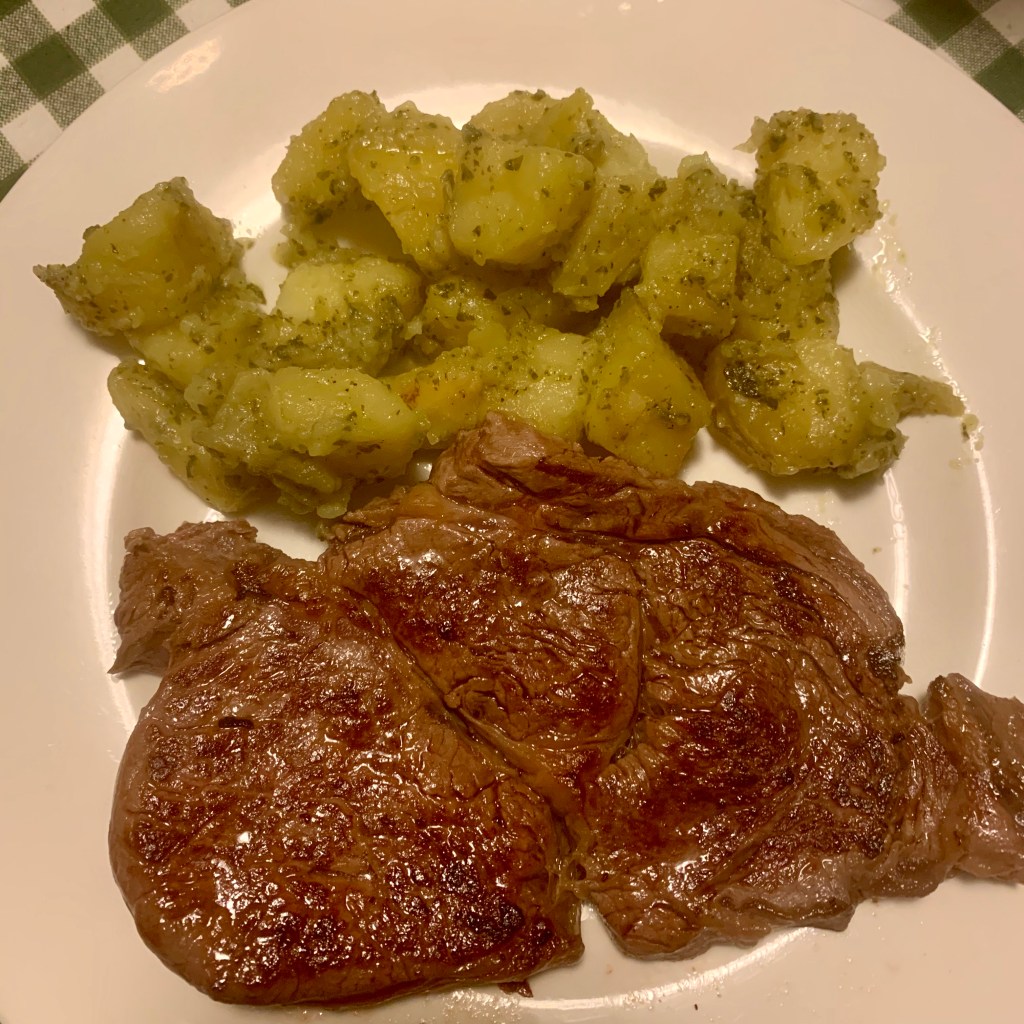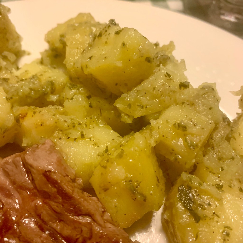 E poi le patate al verde. E’ un piatto semplicissimo, ma che allora era un pò laborioso: non si usavano i tegami antiaderenti, perciò andava cucinato con gli occhi sul fuoco in quanto le patate non dovevano, e non si devono, assolutamente attaccare.