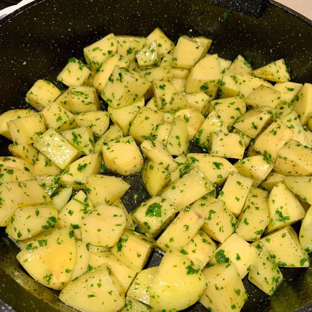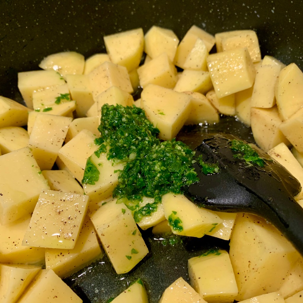 L’altra sera ho preparato il trito di aglio e prezzemolo (con un mazzo di prezzemolo e due spicchi di aglio) per fare dei funghi al forno. Quello avanzato l’ho messo in un vasetto in frigo. Perciò stasera che mi serve un contorno, approfitto di averlo già pronto e provo a replicare la ricetta di nonna Marcellina! Quindi cominciamo a pelare le patate…