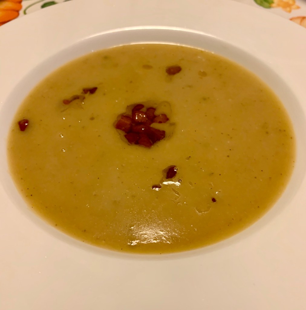 Intanto ho fatto abbrustolire la pancetta in un pentolino, senza nessuna aggiunta di grassi. Quando è diventata bella croccante l’ho messa da parte tenendola in caldo. Quando i fagioli cannellini sono cotti ho frullato tutto, aggiungendo poco brodo casomai la vellutata risultasse troppo densa.