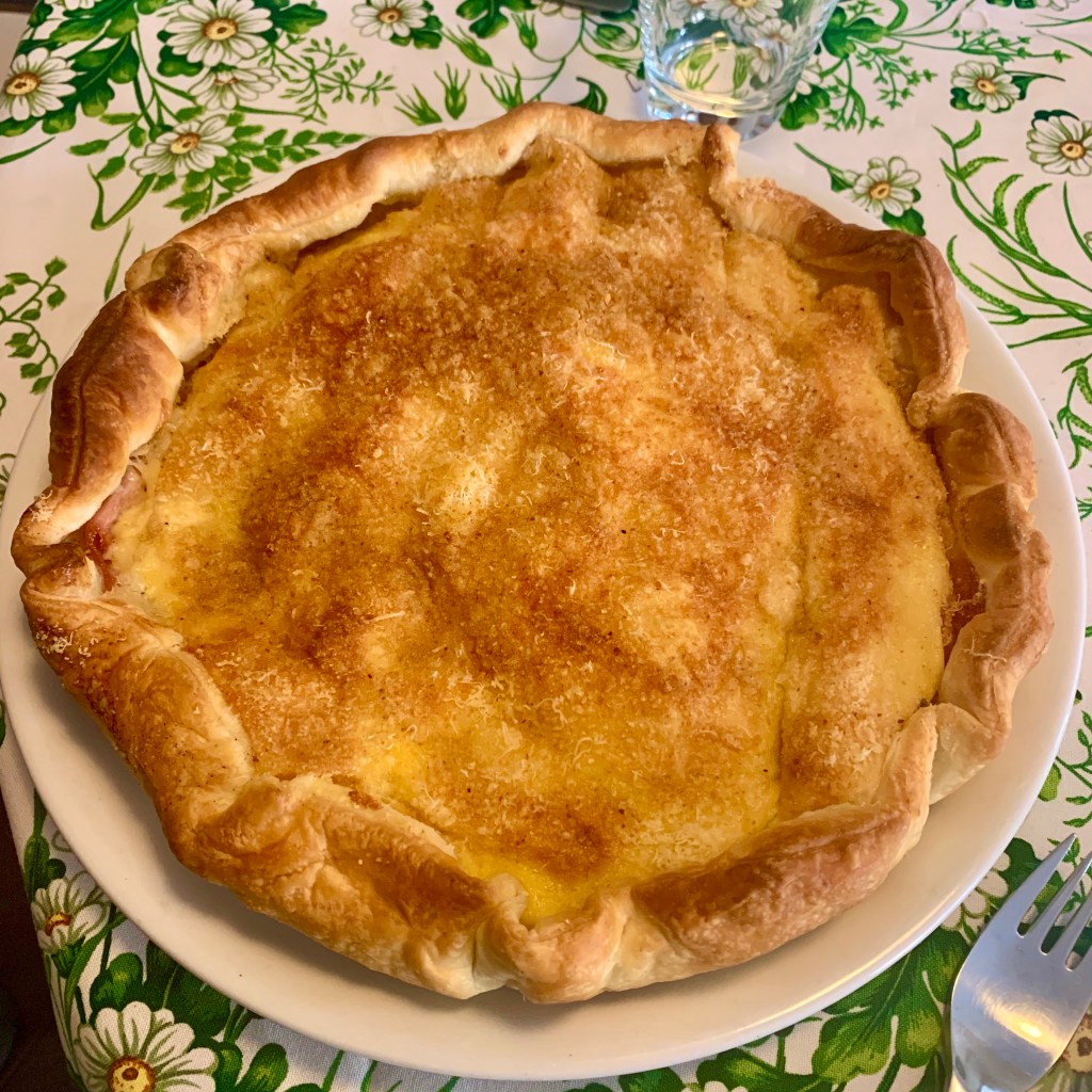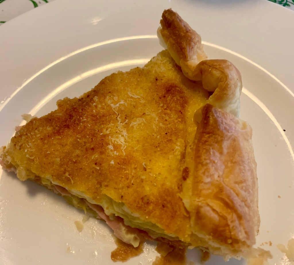 Ho foderato la teglia con la pasta sfoglia, ho disposto nel fondo il prosciutto, la belga tagliata per lungo ma non troppo sottile, poi le fette di formaggio. Ho poi sparso sulla superficie le uova sbattute con sale e pepe.