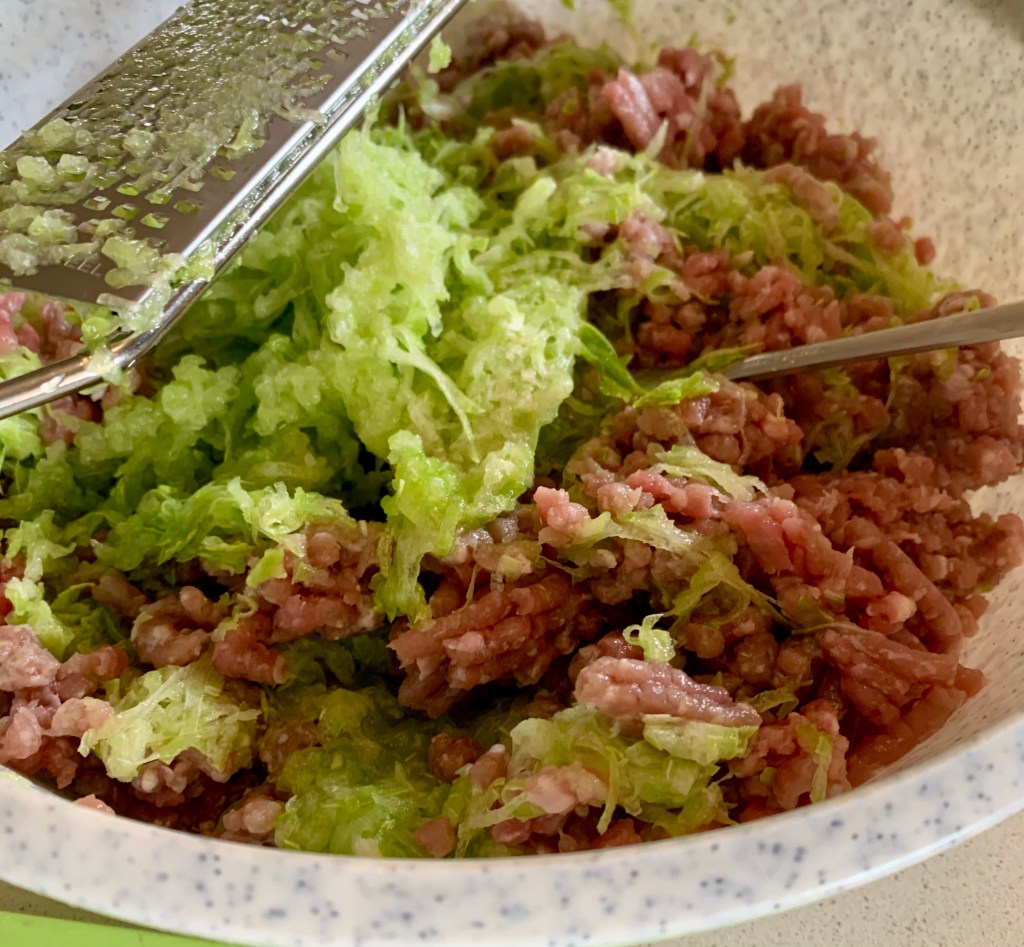 Ho impastato tutto con il trito di carne, mentre il mazzetto di asparagi bolliva. Ho aggiunto alla carne sale e pepe, il formaggio e il prosciutto cotto tagliati sottili, noce moscata, due uova intere, poco parmigiano, qualche cucchiata di latte e poco pan grattato.