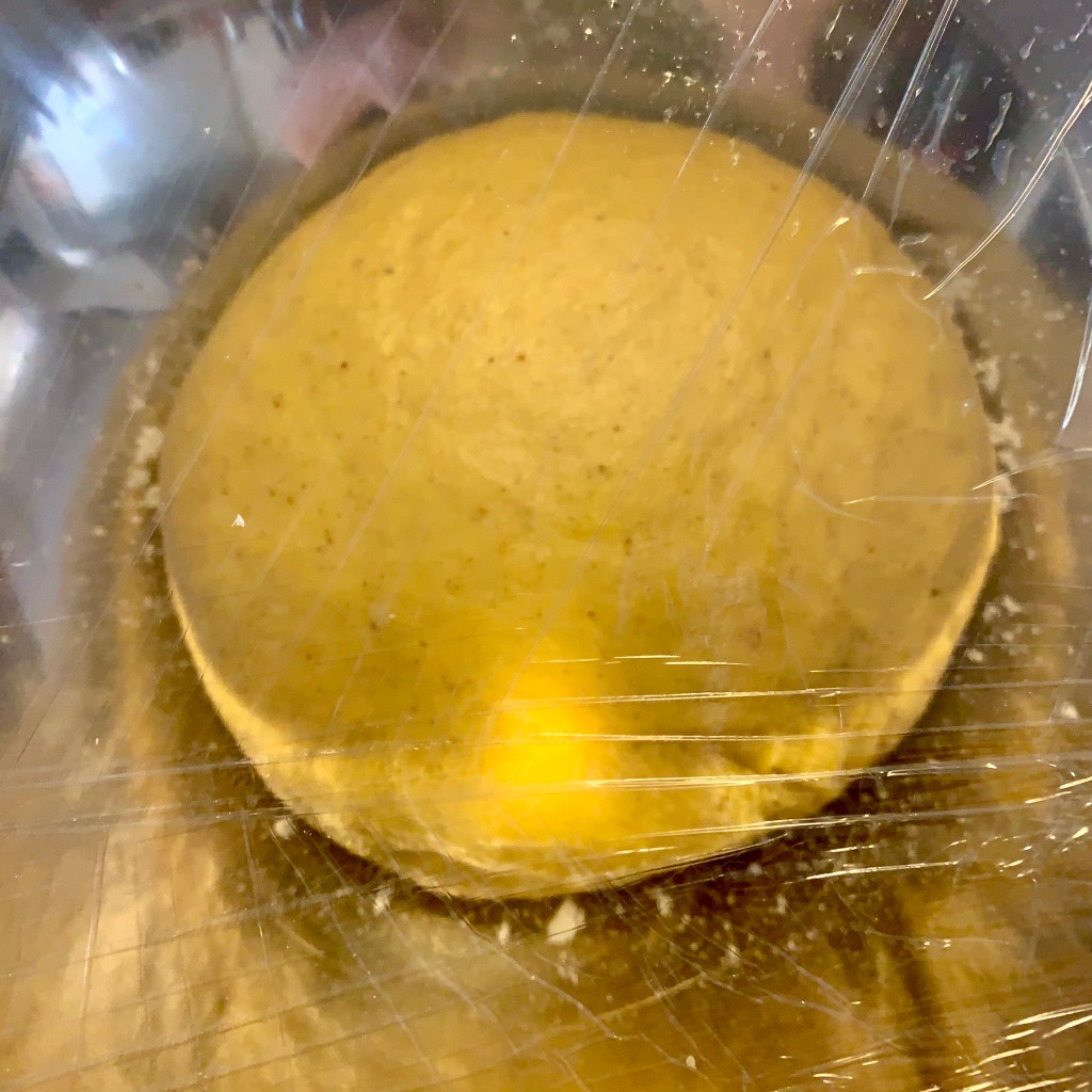 Quando ha raddoppiato il suo volume ho steso con il matterello, formando un rettangolo con uno spessore di circa 2,5 cm. L’ho adagiato in una teglia foderata di carta forno: la ricetta diceva di usare una teglia 23X30 cm. Ho coperto con la pellicola e ho rimesso a lievitare per altre 2 ore circa.